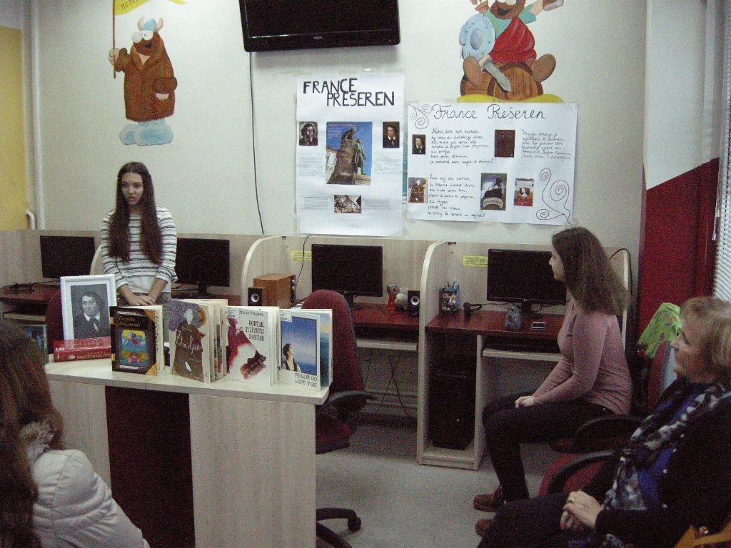 Februar je mesec kulture, zato smo se odločili, da spregovorimo o Francetu Prešernu. V petek, 23. februarja, so v knjižnico prišli učenci 9. razreda Osnovne šole Branko Čopić. Učence sta pozdravili Aleksandra Čvorović in predstavnica Društva Slovencev Triglav Marija Petković. O Prešernovem življenju je govorila Iva Potkonjak, njegovo delo pa je predstavila Aleksandra Špehar. Barbara Hanuš je prebrala pesem Zdravljica v slovenščini, Aleksandra Špehar pa prevod pesmi v srbščini. Učenci so dobili delovni list in pokazalo se je, da niso imeli težav pri reševanju. Zastavili smo jim tudi nekaj vprašanj in hitro smo slišali pravilne odgovore. Njihovo razumevanje slovenščine smo preskusili tako, da so po poslušanju pesmi Povodni mož povedali zgodbo Urške in povodnega moža. Je Urška preživela? Kje sta s povodnim možem živela? Vse to smo izvedeli v zadnjem delu ure, ko so učenci povedali, kako si zamišljajo nadaljevanje pesmi. Nasmejali smo se njihovim izvirnim zamislim.