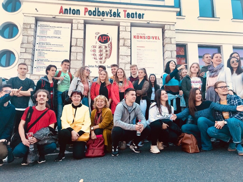 Pozorišna predstava KONS:O:VEL, upriličena je baš na taj dan za učenike banjalučke i ptujske gimnazije učesnike ove radionice. Filozofsko-dokumentarna predstava, u režiji Matjaža Bergerja, izvedena je u Anton Podbevšek Teatru, a govori o životu i djelu poznatog avangardnog pjesnika Srečka Kosovela. Budući, da je predstava izvođena na slovenačkom jeziku, posjetioci iz Banja Luke, mogli su je pratiti preko titlova na engleskom jeziku. Po završetku ove, za sve nas do sada neviđene i nesvakidašnje predstave (po scenografiji, režiji, kao i glumi), međusobne utiske o njoj mogli smo razmijeniti u holu ovog pozorišta, uz sokove, voće i ukusne kroasane.