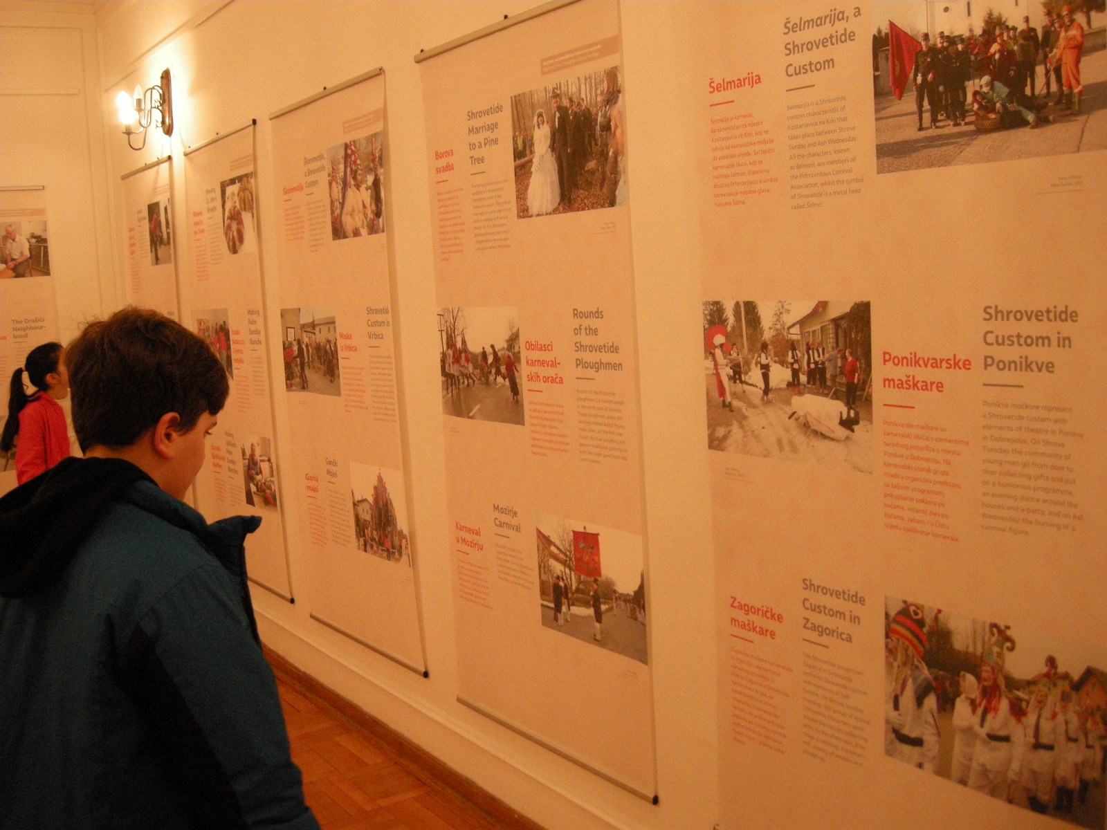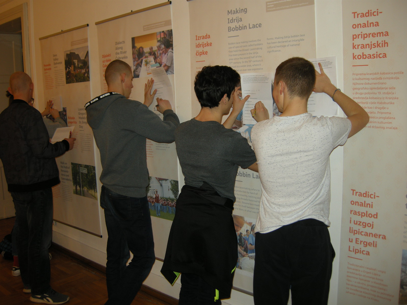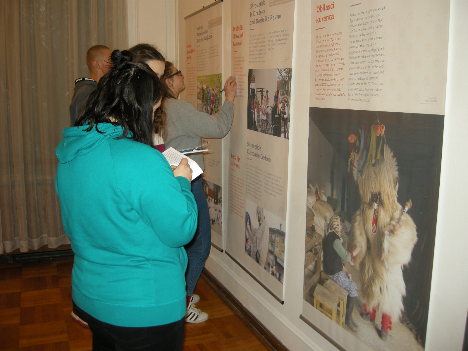 Pustna sobota je bila pravi dan za ogled panojev, saj na razstavi spoznamo veliko starih pustnih običajev, predstavljeni so tudi obhodi kurentov. Učenci dopolnilnega pouka slovenščine so si pozorno ogledali razstavo, ob panojih so reševali delovni list. Kje poteka šelmarija, zakaj potrebujemo skodle, kje izdelujejo čipke, kako rečejo tradicionalno pobarvanim jajcem v Beli krajini in kako v Prekmurju, kdaj spuščajo otroci v vodo gregorčke, kaj je mohant – to so le nekatera od vprašanj, na katera najdemo odgovor na razstavi. Učenci so se strinjali, da Slovenija skriva veliko zanimivosti in da so o mnogih narodnih običajih pri dopolnilnem pouku slovenščine že veliko slišali. Tako kot za slovenščino velja, da ima vsaka vas svoj glas, tako je tudi kulturna dediščina Slovenije zelo raznolika. Prenašanje tega bogastva na mlade je eno izmed poslanstev društev Slovencev, ki se povsod po svetu trudijo ohranjati slovenski jezik in kulturo.