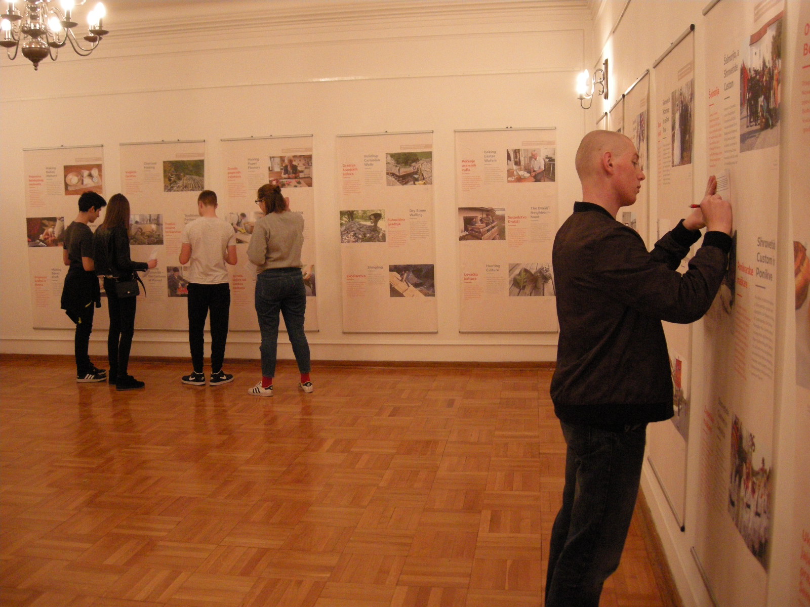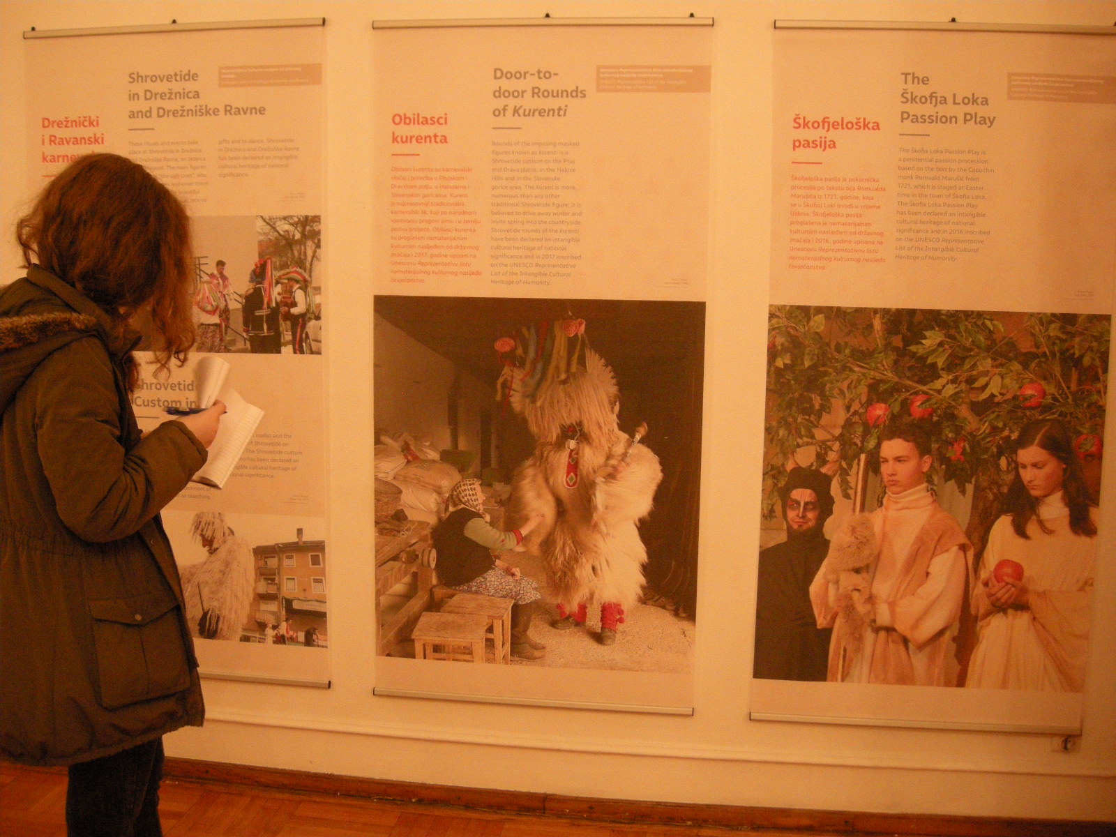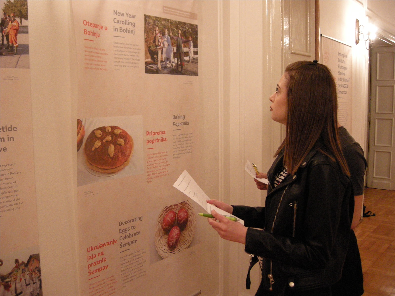 Pustna sobota je bila pravi dan za ogled panojev, saj na razstavi spoznamo veliko starih pustnih običajev, predstavljeni so tudi obhodi kurentov. Učenci dopolnilnega pouka slovenščine so si pozorno ogledali razstavo, ob panojih so reševali delovni list. Kje poteka šelmarija, zakaj potrebujemo skodle, kje izdelujejo čipke, kako rečejo tradicionalno pobarvanim jajcem v Beli krajini in kako v Prekmurju, kdaj spuščajo otroci v vodo gregorčke, kaj je mohant – to so le nekatera od vprašanj, na katera najdemo odgovor na razstavi. Učenci so se strinjali, da Slovenija skriva veliko zanimivosti in da so o mnogih narodnih običajih pri dopolnilnem pouku slovenščine že veliko slišali. Tako kot za slovenščino velja, da ima vsaka vas svoj glas, tako je tudi kulturna dediščina Slovenije zelo raznolika. Prenašanje tega bogastva na mlade je eno izmed poslanstev društev Slovencev, ki se povsod po svetu trudijo ohranjati slovenski jezik in kulturo.