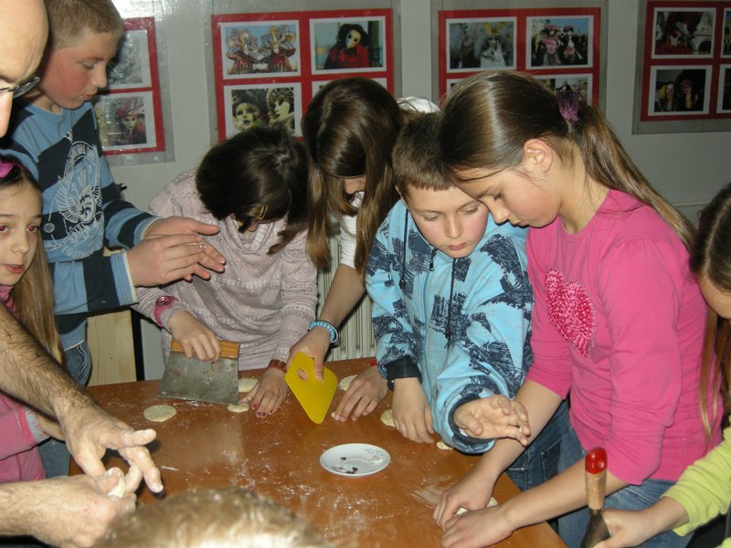 V delavnici, ki sta jo vodili Aleksandra in Marina, so otroci barvali pirhe – ne čisto pravih, ampak kar take iz papirja, nalepili so jih na karton, da so nastali lepi plakati. Franci je udeležence delavnice naučil, kako lahko iz testa oblikujejo zajčke in preste, pod spretnimi otroškimi prsti pa so nastale še ribe. Vse to so tudi spekli in nekateri so svoje umetnine kar takoj pojedli. V četrti delavnici smo ustvarjali vabila za predstavo Moj dežnik je lahko balon. Predstavo bodo pripravili učenci dopolnilnega pouka slovenščine pod vodstvom lutkarjev Jelene Sitar in Igorja Cvetka. Že zdaj vas vse vabimo, da 12. maja skupaj z nami odletite v deželo Klobučarijo. Predstava bo v mestnem gledališču Jazavac ob 11.00.
