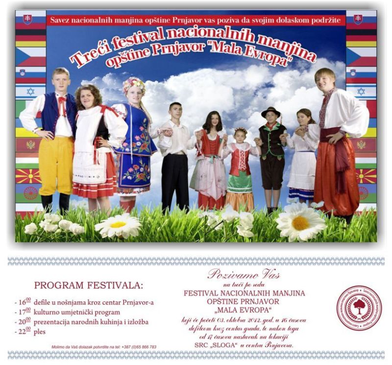 Dana 3. 11. 2012. godine, Udruženje Slovenaca «Triglav» Banja Luka se rado odazvalo, na poziv organizatora festivala g. Franje Rovera, da učestvuje na III Festivalu nacionalnih manjina opštine Prnjavor «MALA EVROPA 2012». U okviru Festivala je bio organizovan svečani defile učesnika u nacionalnim nošnjama kroz centar grada. Kulturno - umjetnički program, prezentacija narodnih kuhinja i izložba su održani u dvorani SRC «Sloga» koja je bila bogato ukrašena etno eksponatima.