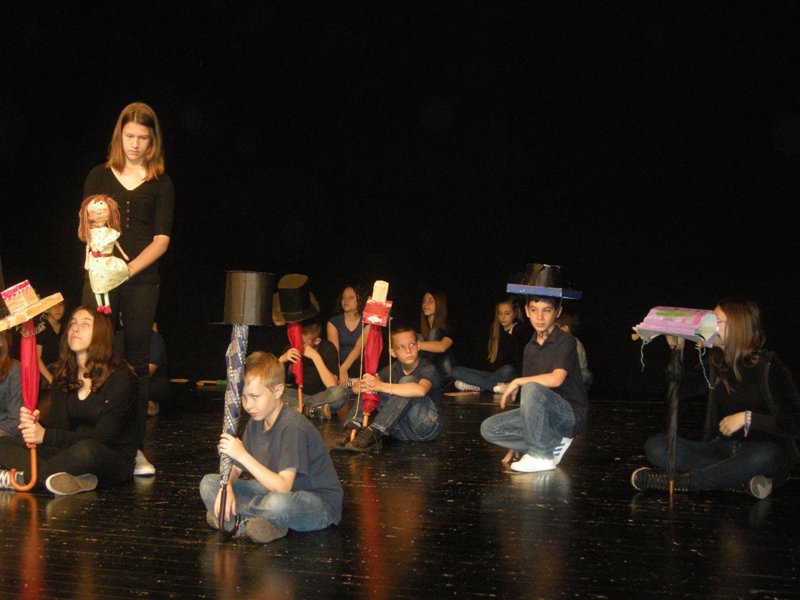 U petak su cijeli dan pravili maske i lutke, u subotu su razdijelili uloge i vježbali, u nedjelju su već pokazali rezultate svog rada. Nastala je predstava „Moj kišobran može biti i balon“, a djeca su je odigrala pred punom dvoranom pozorišta Jazavac. Bajka Ele Peroci nas je povela u zemlju Klobučariju. Nastupalo je više od tridesetoro djece, a predstavu je pratila muzika – čuli su se zvuci harmonike, gitare i violine. Fotografije govore više nego riječi, mada je teško opisati šta sve su morala djeca napraviti i naučiti da bi mogli odigrati predstavu.