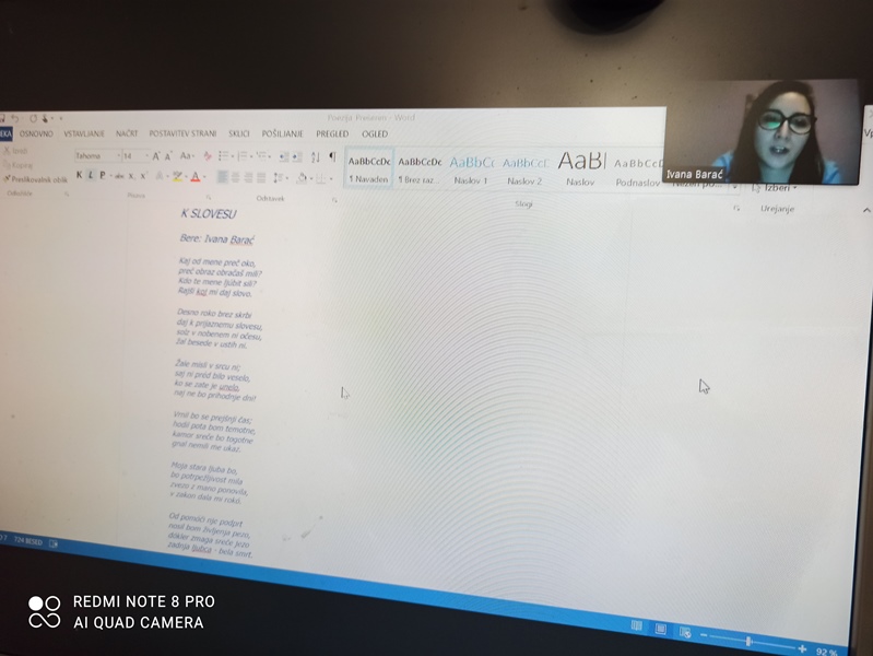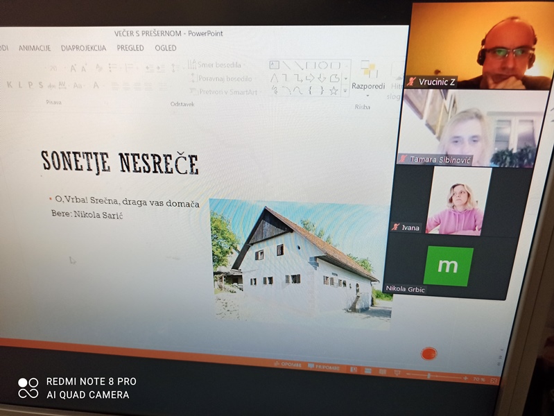 U četvrtak, 11. februara 2021. godine, u 18 sati, održana je kulturna manifestacija u čast Prešernovoj poeziji koju su čitali i odabrali studenti izbornog predmeta slovenački jezik na Filološkom fakultetu Univerziteta u Banjoj Luci pod mentorstvom njihovog predavača doc. dr. Janje Vollmaier Lubej.
