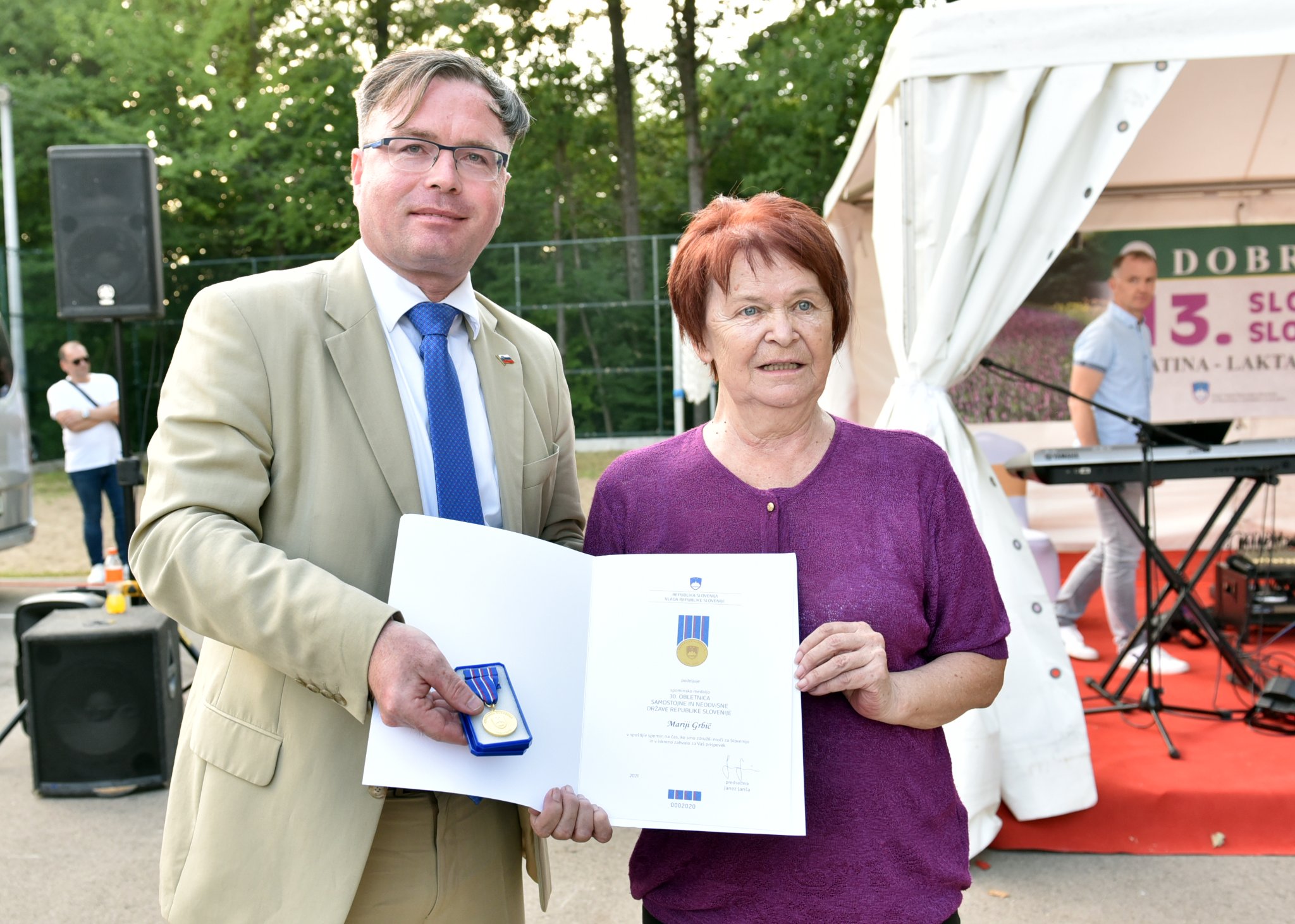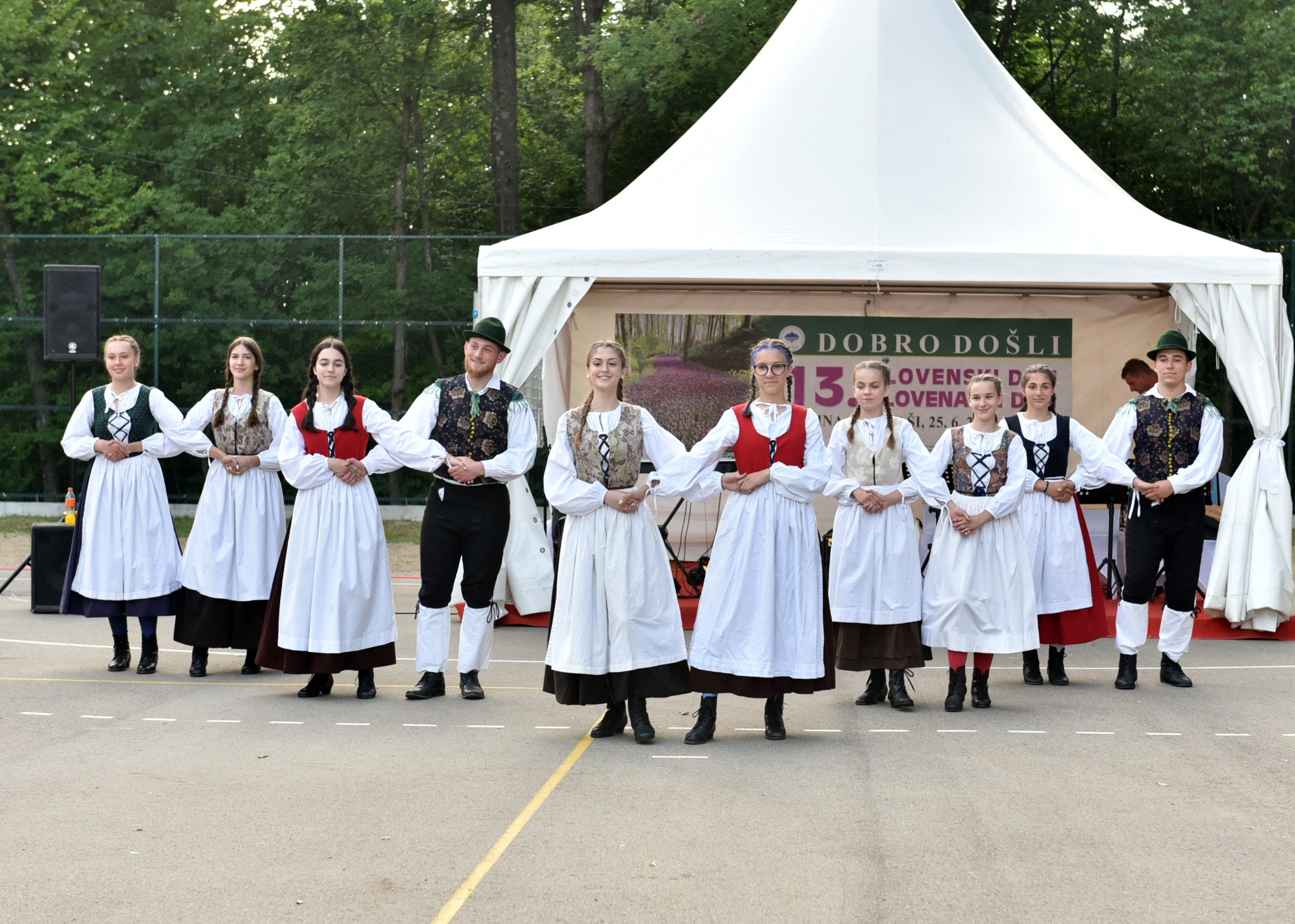 Slovenija 25. juna slavi Dan državnosti, tako da su njegove čestitke bile posvećene prazniku koji slave Slovenci u zemlji i inostranstvu i proslavi XIII slovenačkog dana. Predsjednici Udruženja Slovenaca Triglav Mariji Grbić na svečanosti je uručena prigodna medalja Vlade Republike Slovenije povodom 30. godišnjice samostalne države Republike Slovenije. Za Mariju je ovo bilo neočekivano iznenađenje, a ni suza nije nedostajalo, dok je na kraju uslijedio glasan, zaslužen aplauz. Program je nastavljen slovenačkom narodnom pjesmom koju je otpjevao Mješoviti hor Davorin Jenko. Folklorna grupa Udruženja Triglav nas je plesom odvela od Triglava do Banje Luke. Gosti iz Banjalučkog veza otpjevali su četiri pjesme uz pratnju instrumentalista, ali na kraju, kako je to uobičajeno u našoj sadašnjoj domovini, odigralo se i kolo. Ovoga puta imali smo priliku da čujemo odlično izvedeno kolo Kolubarski vez na narodnom instrumentu fruli.