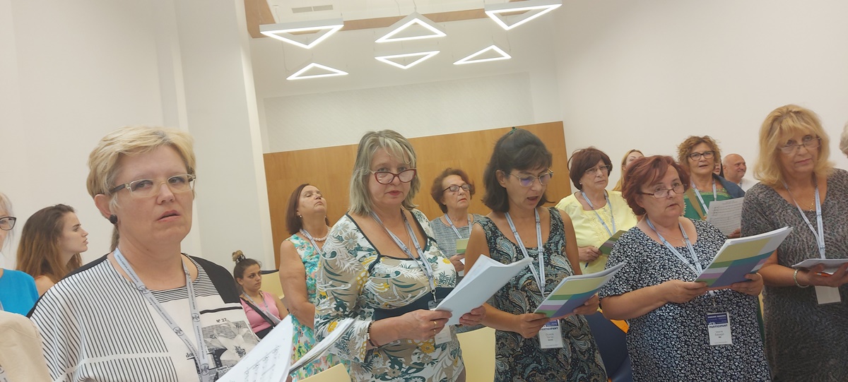 Ujutro smo u muzičkoj školi “Isidor Bajić” upoznali ljubazne domaćine, koji su nam dali akreditacije i uputili nas na radionicu A1 sa tamburašima. Dočekao nas je dirigent iz Sombora Milan Radišić. Uslijedilo je kratko upoznavanje i razigrani horovođa, mladi Somborac započeo je probu tako što smo jedni druge ukrug kratko masirali, uz puno smijeha i šaljivih komentara. A zatim je uslijedilo upjevavanje. Svima nam je godila masaža pa smo predložili Vanji da i mi uvedemo masaže na naše probe. Na našoj radionici su bili pjevači iz Plovdiva iz Bugarske, pjevačica iz Ljubljane, pjevači iz Poljske i nekoliko pjevača iz Novog Sada. Lijepo društvance se savršeno popunilo kad nam se je, kao pjevačica pridružila i naša dirigentica Vanja. Tako da smo sa njom pjevali zajedno kao nekad kad je došla da pjeva u slovenački hor.