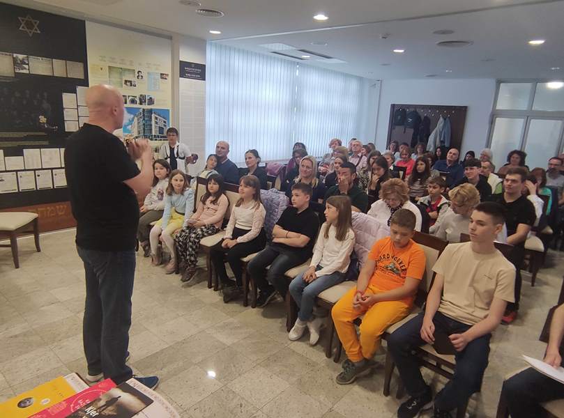 Uslijedio je nastup pisca - svojim zabavnim i iskričavim nastupom zadivio je i djecu i odrasle, predstavio svoje književne junake i povjerio nam se odakle crpi svoj materijal za književno stvaralaštvo. Sve što piše je istina, naglasio je, a mi smo se zapitali da li je to stvarno tako. Uz sve njegove nezgode, uvjerili smo se da vrijeme zaista liječi rane. Puna sala Jevrejskog kulturnog centra u Banjoj Luci dokaz je da učenici i članovi Udruženja radu slušaju slovenački.