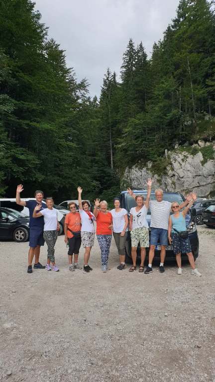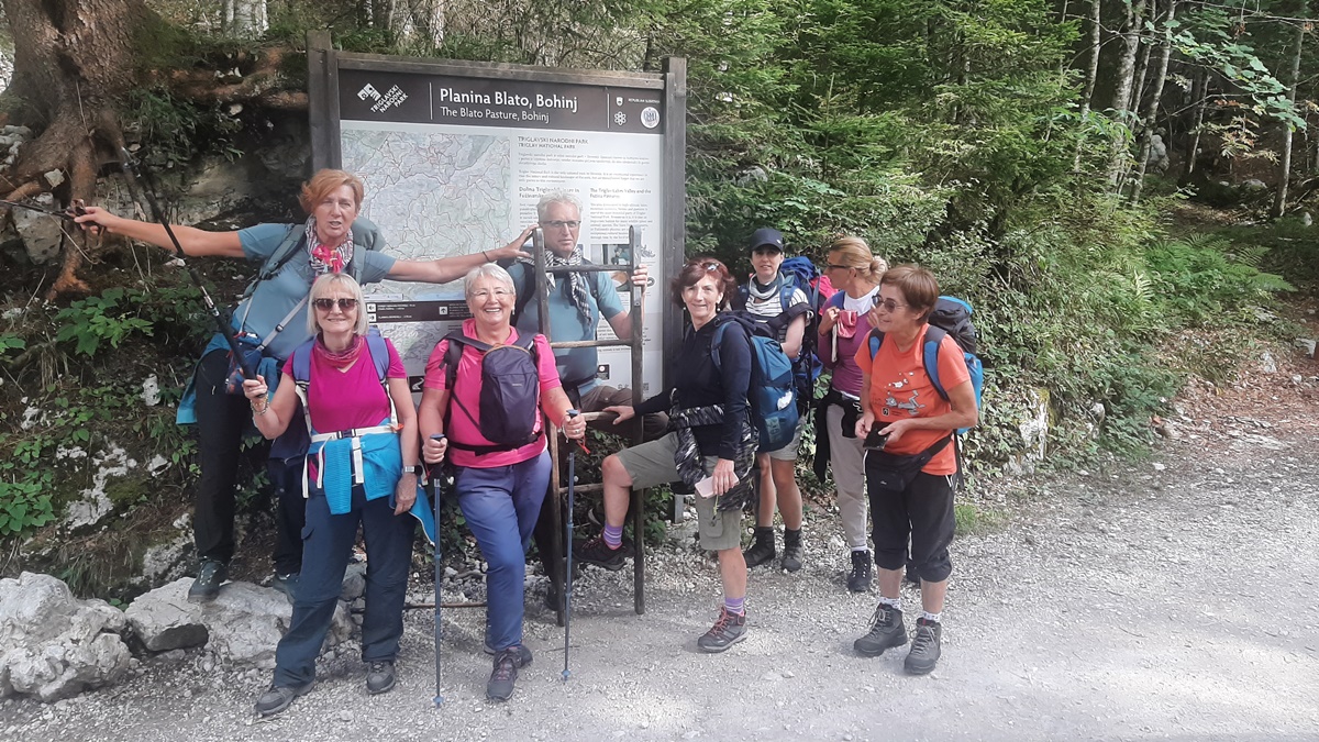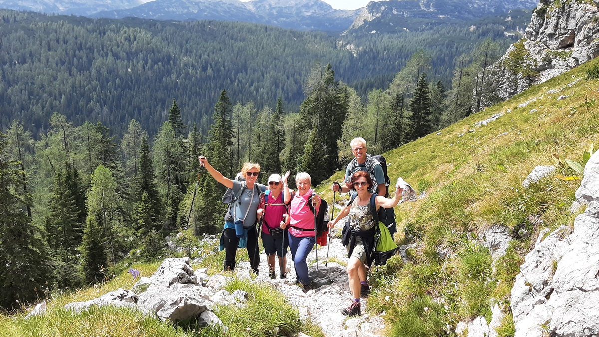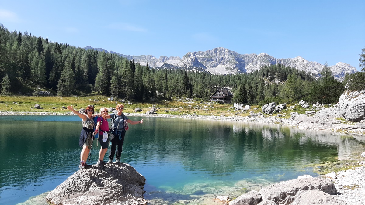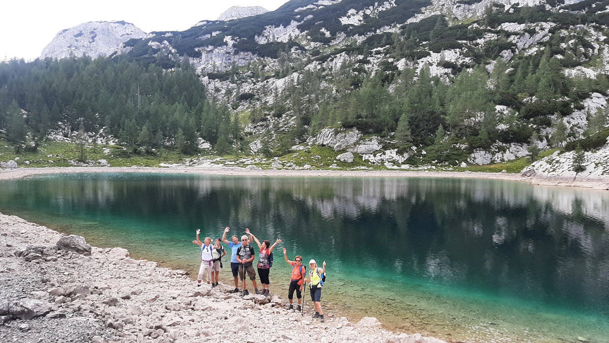 Iznajmili smo kombi, Ivan je bio vozač i već u dva sata, rano ujutro smo redom pokupili raspoložene putnike i krenuli prema granici. Sve je teklo besprijekorno, petak nije bilo gužve na putu. Prva kafa je bila kad smo ušli u Sloveniju i tu smo na parkingu i doručkovali. To je bez pretjerivanja, bila prava slavska trpeza. Počelo je, kako i dolikuje, sa rakijom. Izbor je bio šljiva, travarica, a Zdenka je dodala i drenju. Nema dalje. A onda kiflice Bernardine mame, Olgina slana, slatka pita, suhomesnate delicije, sir, domaći paradajz, paprika i kolač sa šljivama. Kad smo se lijepo okrijepili, nastavili smo put ka Bledu i Bohinju i planini Blato (1147 m). Na Planini Blato bila je ogromna gužva i jedva smo našli mjesto za parkiranje. Obukli smo gojzerice, uprtili teške rance na leđa i oko pola 10 krenuli uz brdo. Naravno prvo smo se slikali da ovjekovječimo trenutak početka uspona. Ranci su nas pritiskali, nije bilo lako, ali nismo se kolebali grabili smo uz brdo. Naprijed u avanturu. Vrijeme predivno, baš kako treba. Gledamo ponosne borove koji strše uvis, vrhove planina koji ih nadvisuju obasjane suncem i upijamo tu ljepotu. Noge idu same i za sat vremena stigosmo do Koče na planini pri jezeru (1453 m). Kad smo izlazeći iz šume ugledali dom sav u cvijeću, obasjan suncem, a oko njega krave pasu, morali smo zastati da se divimo toj nesvakidašnjoj ljepoti. Bili smo sretni što smo savladali prvu etapu na našem putu, krenuli smo da sjednemo da se odmorimo popijemo kafu, a kad smo ugledali jezero zelene boje okruženo visokim borovima, preplavio nas je osjećaj sreće. Nismo mogli odvojiti pogled od jezera, odmarali smo se gledajući njegovu smaragdnu boju. Nakon kratkog predaha, morali smo krenuti dalje. Na pola sata hoda bila je planina Dedno polje. To su bili katuni smješteni u jednoj sunčanoj dolini podno planinskih vrhova. Tu ste mogli da naručite kiselo mlijeko, žgance, štruklje, sir i pastirsku rakiju. Pošto smo kratko hodali, nismo svraćali, nastavili smo put prema Ovčariji. Bili smo otprilike na pola puta. Do Koče pri sedmerih jezeri (1685 m) išli smo preko Prodova gdje je krajolik bio bajkovit. Vidjeli su se vrhovi okolnih planina i u šumi smo vidjeli dom na Komni. Staza je bila kamenita strma i morali smo biti jako oprezni. Do našeg cilja smo stigli za dva i po sata. Prvo smo ugledali Dvojno jezero i nismo mogli odoljeti, uputili smo se prema jezeru, odmorili smo se i sa uživanjem stavili u vodu umorne noge. U jezeru su se ogledali vrhovi Tičarice. Pored jezera je bio smješten dom, oko kojeg vrvilo kao u košnici, od planinara. Već malo umorni, nešto smo pojeli, dogovorili se da ujutro krećemo na hodanje u pola 7 i otišli da spavamo puni utisaka.