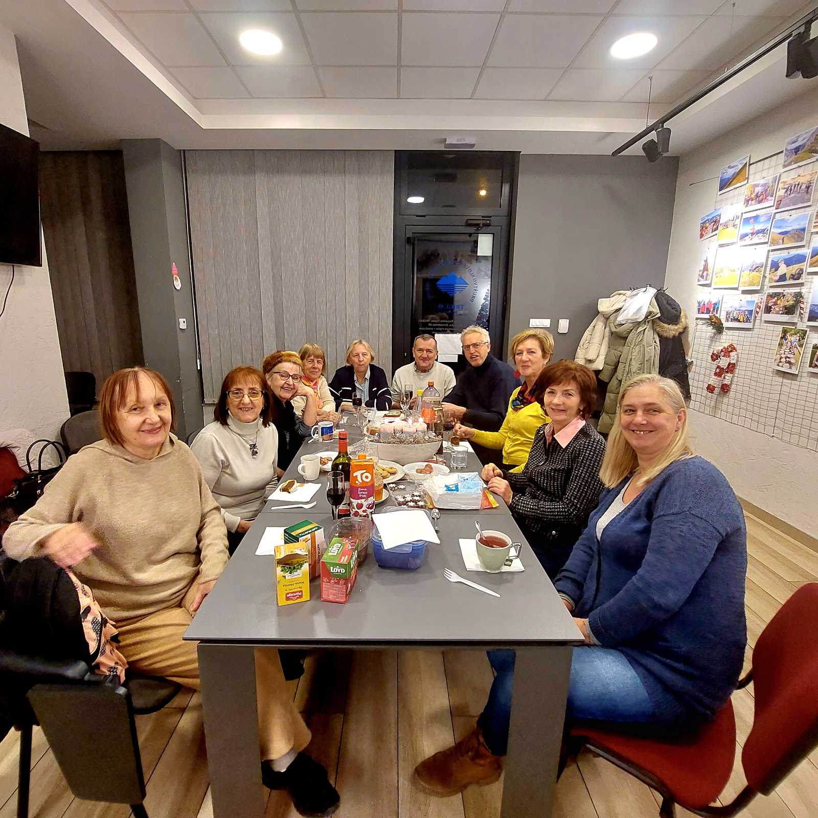 Metoda je uz pomoć mlađih učenika okitila i uredila učionicu, tako kad smo došli na čas, atmosfera je bila prijatna praznična. I mi smo donijeli neke božićne poslastice i vino i zabavljali smo se razgovarajući uz zvuke slovenačke pop muzike. Svi su imali pravo na jednu muzičku želju. Kao vrhunac te prijatne večeri, desilo se nešto što niko nije očekivao, posjetio nas je Božiček! Bili smo baš iznenađeni, ali i sretni jer nas je to za trenutak vratilo u naše djetinjstvo. Uzeli smo poklone i to smo, naravno, ovjekovječili sa jednom fotografijom. Našu dragu vrijednu učiteljicu nije zaboravio Božiček i donio joj je lijepo ukrašene, ručno izrađene, vunene priglavke. Ho Ho Ho