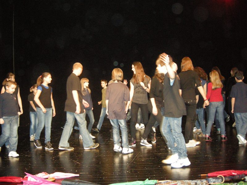 U petak su cijeli dan pravili maske i lutke, u subotu su razdijelili uloge i vježbali, u nedjelju su već pokazali rezultate svog rada. Nastala je predstava „Moj kišobran može biti i balon“, a djeca su je odigrala pred punom dvoranom pozorišta Jazavac. Bajka Ele Peroci nas je povela u zemlju Klobučariju. Nastupalo je više od tridesetoro djece, a predstavu je pratila muzika – čuli su se zvuci harmonike, gitare i violine. Fotografije govore više nego riječi, mada je teško opisati šta sve su morala djeca napraviti i naučiti da bi mogli odigrati predstavu.