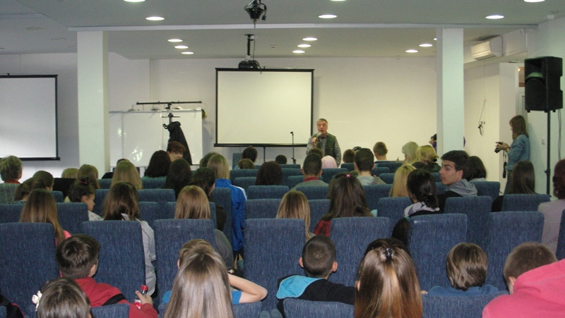 Tokom nastave smo čitali njegove knjige Črvive pesmi, Marela in Mihec gre prvič okrog sveta, a srednješkolci su upoznali Izbrane Rozine v akciji. Pjesnik nam je slikovito predstavio svoj rad, pa i svoju pjesmu koju je napisao još kao osnovnoškolac. Dok smo slušali pjesme Lepa Vida, Povodni mož, Ob Grauževem dnevu, Mleko, Lovec, Marela i druge mogli smo se uvjeriti da je odličan interpretator vlastitih riječi. Postavio nam je i više zagonetki, a na kraju smo zajedno upalili motore i ispalili raketu, koja svakoga može odvesti u svijet bajki. Andrej Rozman Roza spada među najizvornije i najsvestranije savremene stvaraoce u Sloveniji i drago nam je da smo njegov literarno-pozorišni nastup mogli vidjeti na susretima učenika dopunske nastave slovenačkog jezika i kulture.