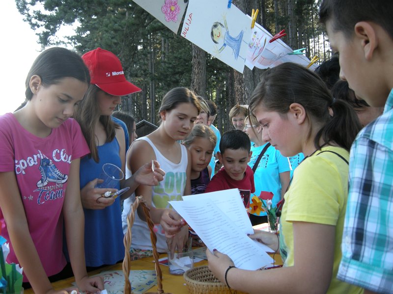 Učenici su učestvovali i na štandu. Predstavljali su predmete, koji su nastali u okviru projekta Sve najbolje, Slovenija. Slike, narukvice i cvijeće, koje smo napravili na kreativnim radionicama, poslali smo u različite države, a naš štand su krasile zastave i cvijeće, koje su napravili naši vršnjaci iz cijelog svijeta. Među predmetima je bio i crveni autobus, koji smo dobili iz Londona. Za posjetioce smo pripremili kviz Šta znaš o Sloveniji? Zanimanje za traženje odgovora na pitanja je bilo veliko, pa smo tako kvizom pomogli širenju znanja o zemlji naših predaka.