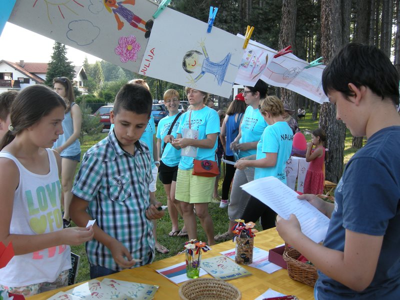 Učenici su učestvovali i na štandu. Predstavljali su predmete, koji su nastali u okviru projekta Sve najbolje, Slovenija. Slike, narukvice i cvijeće, koje smo napravili na kreativnim radionicama, poslali smo u različite države, a naš štand su krasile zastave i cvijeće, koje su napravili naši vršnjaci iz cijelog svijeta. Među predmetima je bio i crveni autobus, koji smo dobili iz Londona. Za posjetioce smo pripremili kviz Šta znaš o Sloveniji? Zanimanje za traženje odgovora na pitanja je bilo veliko, pa smo tako kvizom pomogli širenju znanja o zemlji naših predaka.