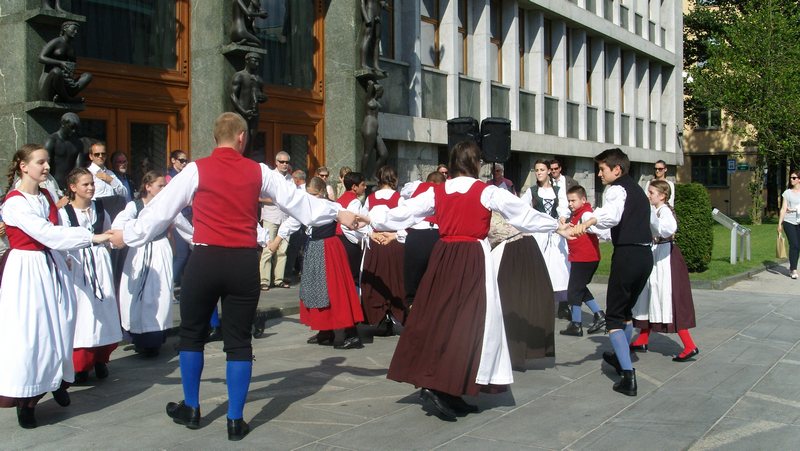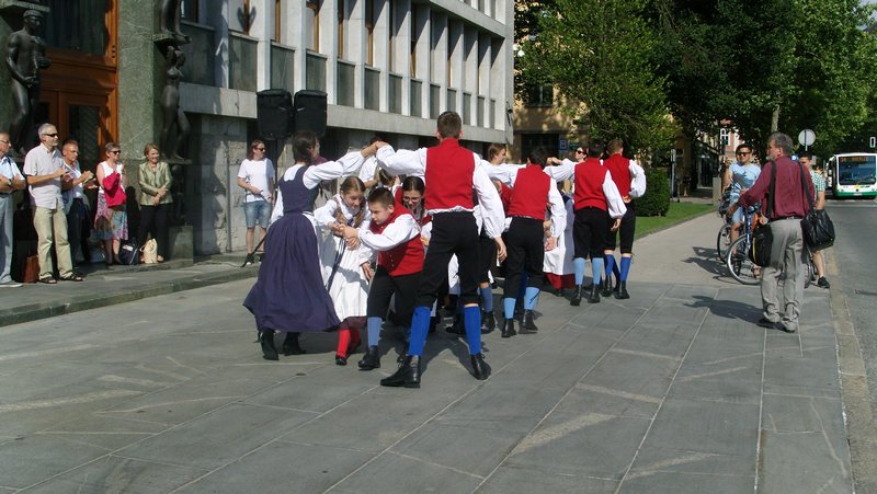 Vrijeme nam nije bilo naklonjeno, dan je bio pakleno vruć, naročito za folkloriste, koji su kao prvi nastupili na Sveslovenačkim susretima. Slovenačkim narodnim plesovima su pred zgradom Narodne skupštine zaželjeli dobrodošlicu svim okupljenim Slovencima, koji su došli iz drugih država te prolaznicima, koji su se uprkos jakom suncu zaustavili i gledali plesnu razigranost naše dječije folklorne grupe.