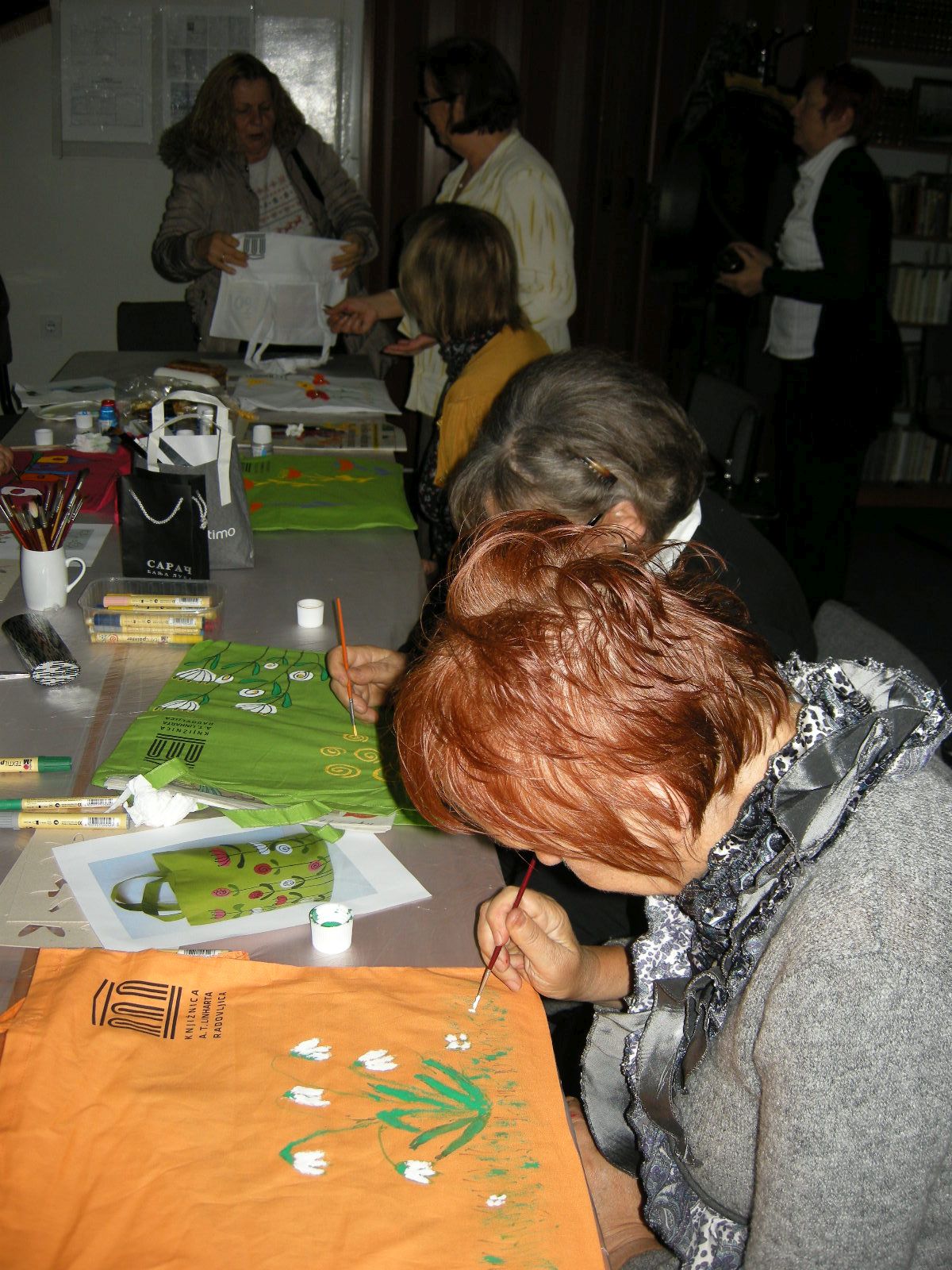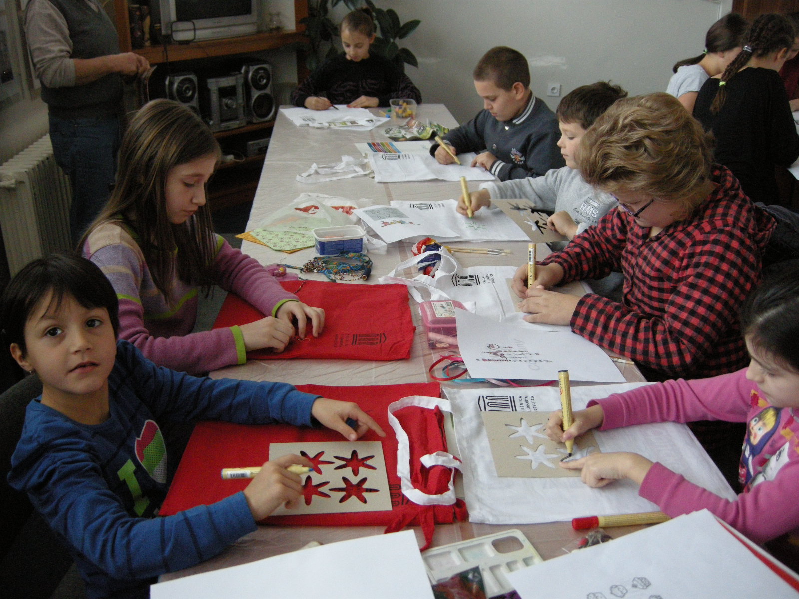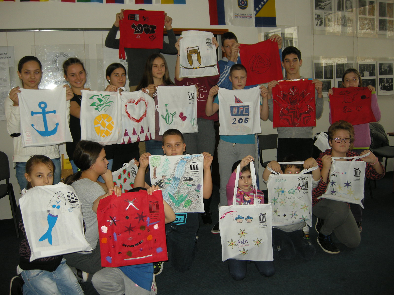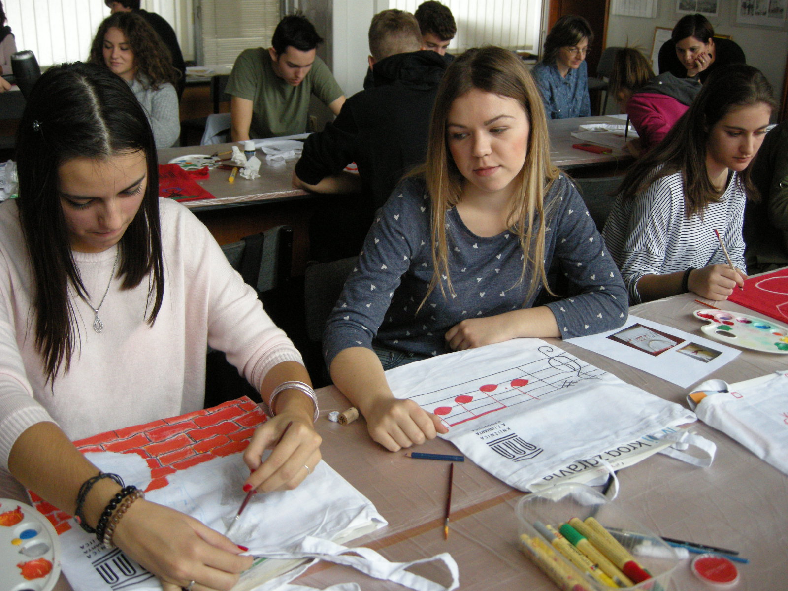 Na radionicama smo krasili platnene torbe. Učestvovali su odrasli, osnovci, srednješolci ali i gosti iz Gimnazije Ledina iz Ljubljane. Svi su mogli pokazati svoj umjetnički dar, neki su crtali, drugi slikali, jedni se poslužili pečatima napravljenim od krompira, a neki su u ruke uzeli iglu i konac i nešto prišili na torbu. Baš svaka torba je zato nešto posebno. Za sve, koji vole stvarati, kreativne radionice su mogućnost za druženje, a predmeti koji nastanu su lijepa uspomena.