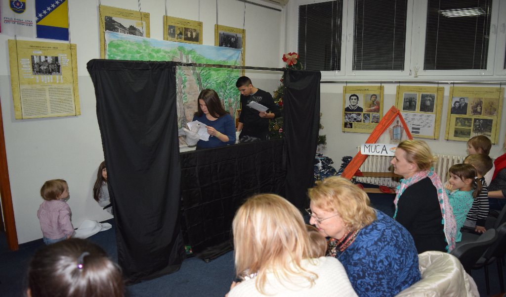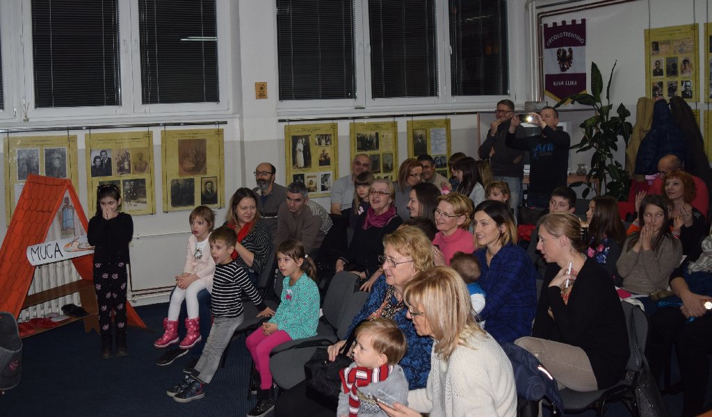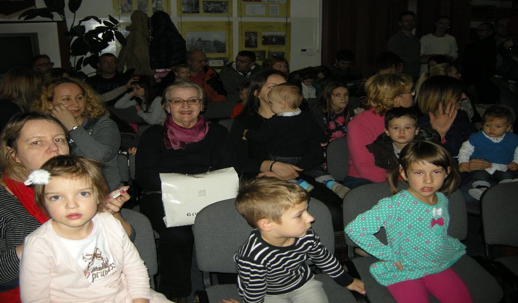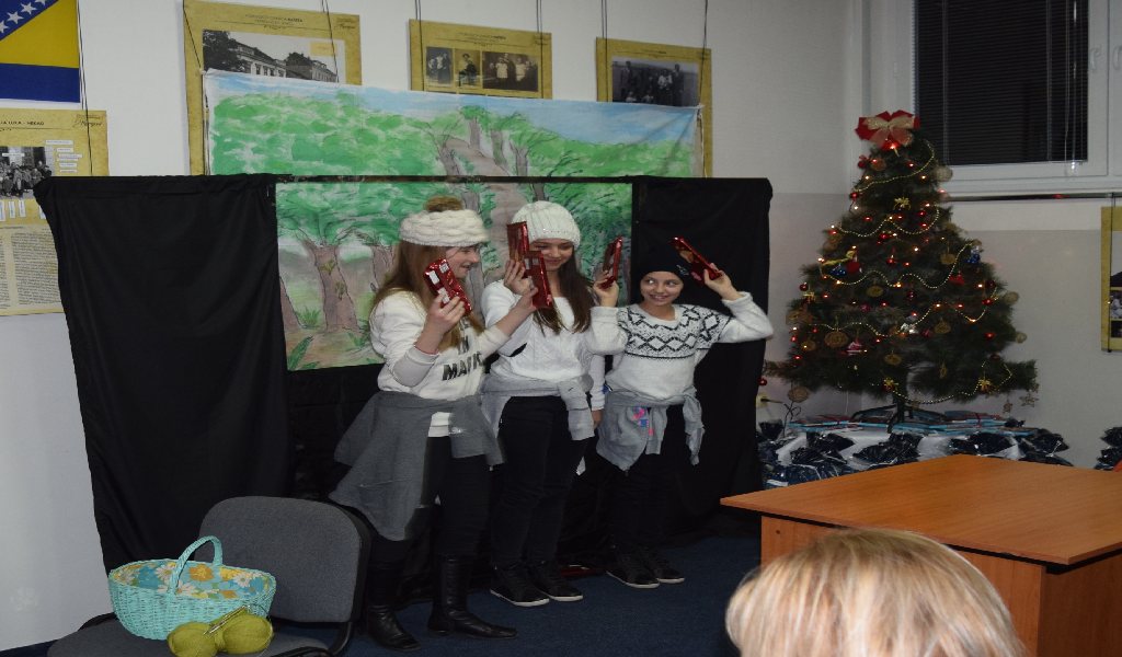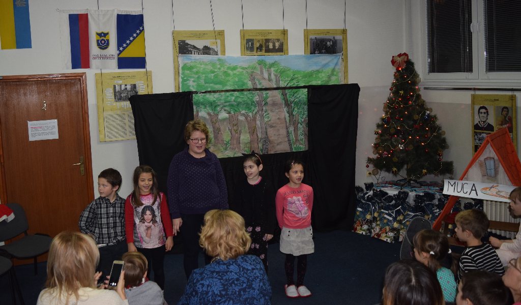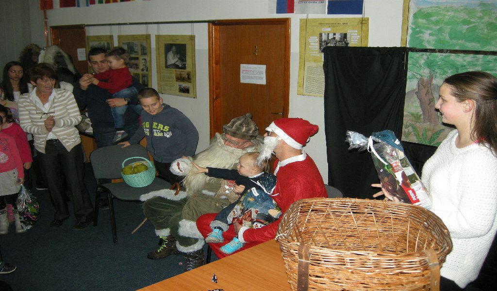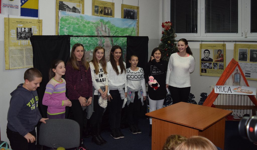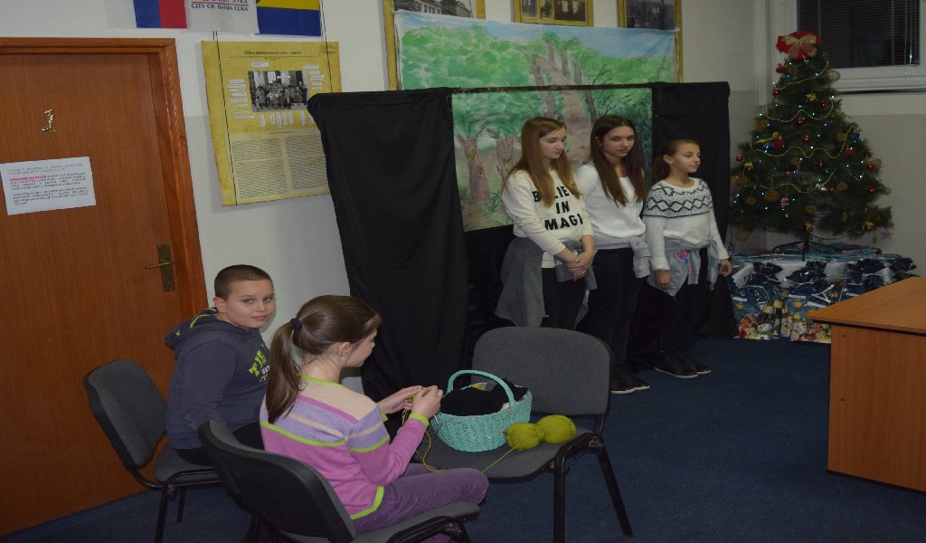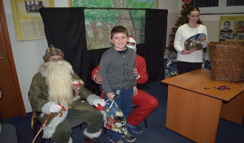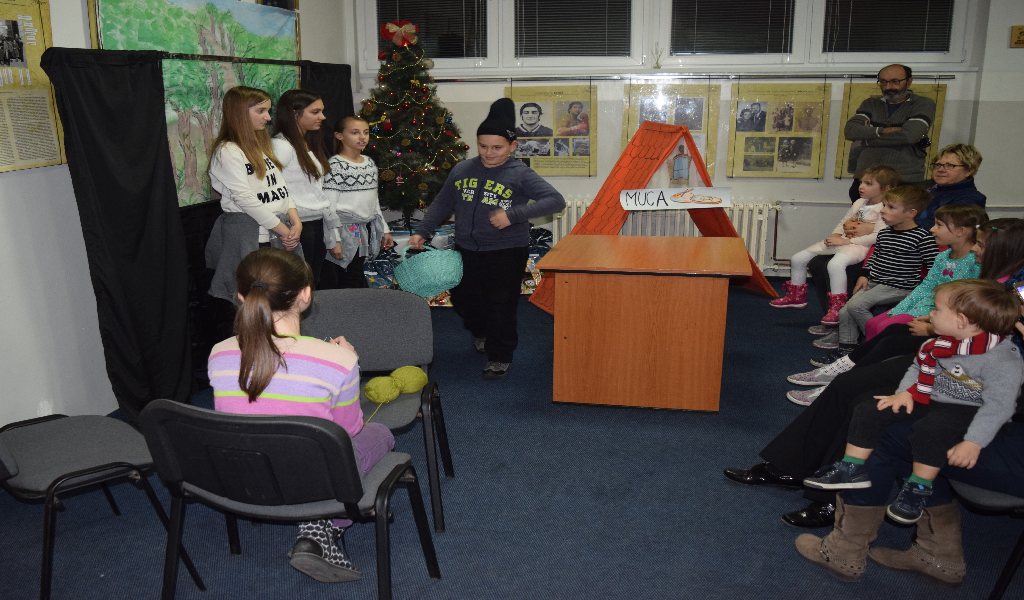 U srijedu, 14. decembra, je jelka u Klubu nacionalnih manjina bila već ukrašena, a djeca su nestrpljivo gledala ko je pod jelku ostavio poklone. Prije nego što smo pozvali Deda Mraza, pogledali smo lutkarsku predstavu „Sapramiška“ te predstave Maca Papučarka i Zahvalni kipovi. Lutkarskom predstavom o mišu, koji je slomio zub, su nas razveselili učenici dodatne nastave iz Slatine. Miš se ohrabrio i otišao zubaru, zato smo na kraju predstave svi zajedno zapjevali pjesmicu Moji bijeli zubići. Uz bajku o Sapramiški odrastaju uvijek nove generacije djece, a omiljena kao hrabri miš je i maca koja djeci odnese papuče ako ih nisu pospremili. Predstavu Maca Papučarka su odigrali naši najmlađi učenici, a stariji učenici su nastupili u predstavi Zahvalni kipovi.