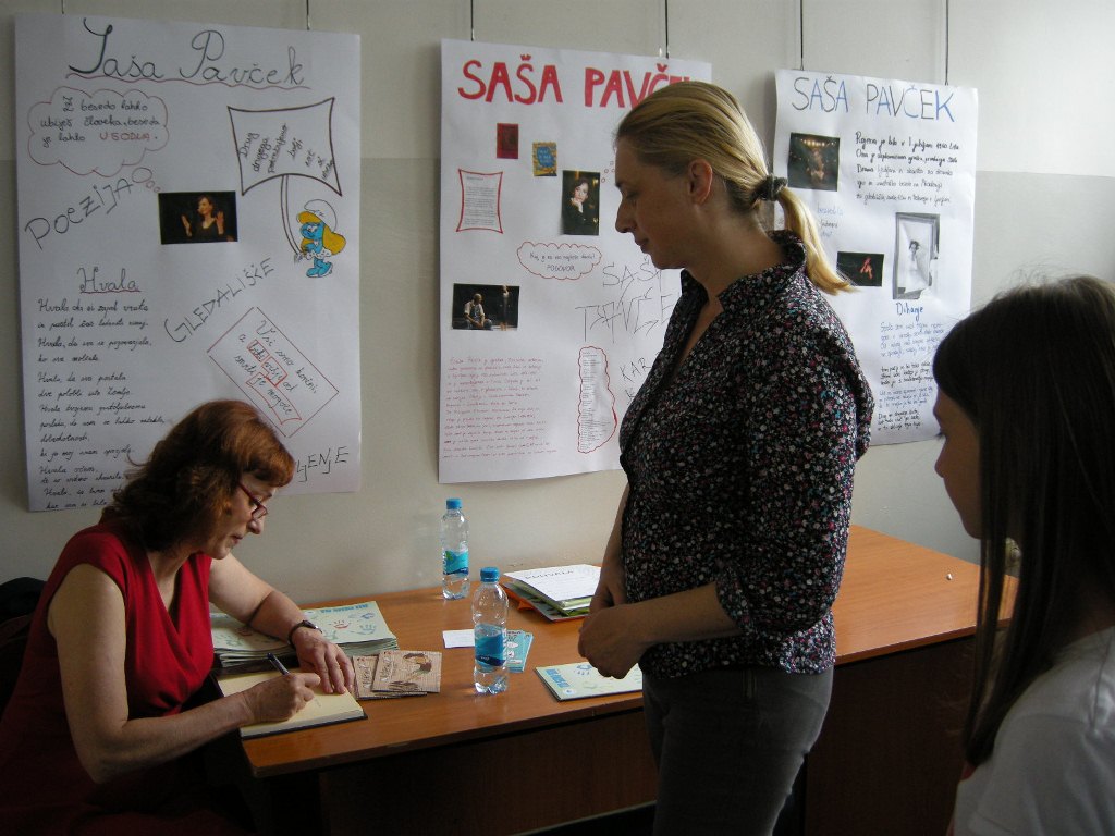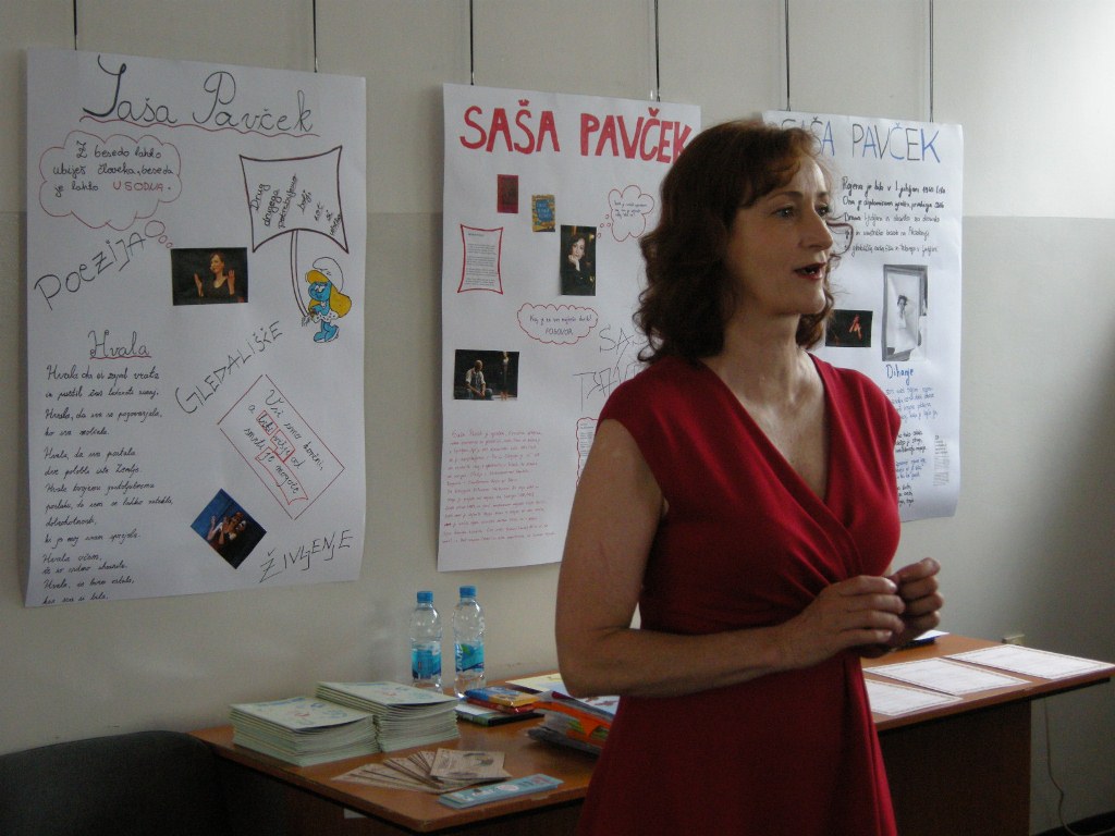 Saša Pavček predaje na Akademiji za pozorište, radio, film i televiziju, a učenicima je jasno predstavila svoj pedagoški rad. Pričala je i o svom pisanju, a zatim je bilo vrijeme za podjelu potvrda. Najmlađi učenici su zaslužili posebne pohvale za redovno pohađanje nastave i za vrijedno učenje. I mladima smo podijelili tri pohvale za prisustvo: Aleksandra Špehar i Elena Lunić nisu tokom cijele godine izostale nijedan čas, a među momcima je najčešće na nastavi bio Viktor Perušić. Čitalačku značku su ove godine dobili Nikša Perušić i Aleksandra Špehar, a dobili su priznanje i knjigu. Nikša Perušić i Jelena Sibinović su dobili priznanje i knjižnu nagradu Gradske biblioteke Ljubljana, gdje su njihovi likovni radovi na konkursu Podvodni svijet izabrani među deset najboljih.