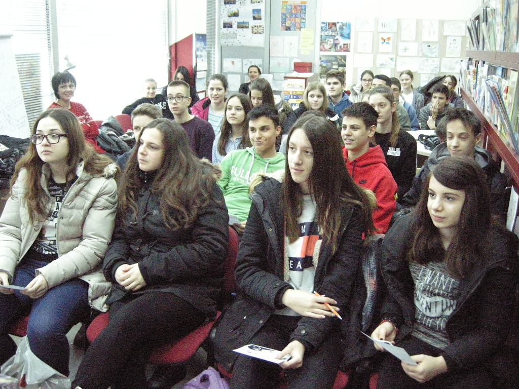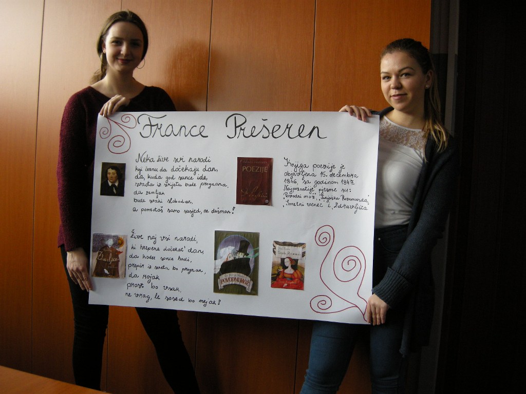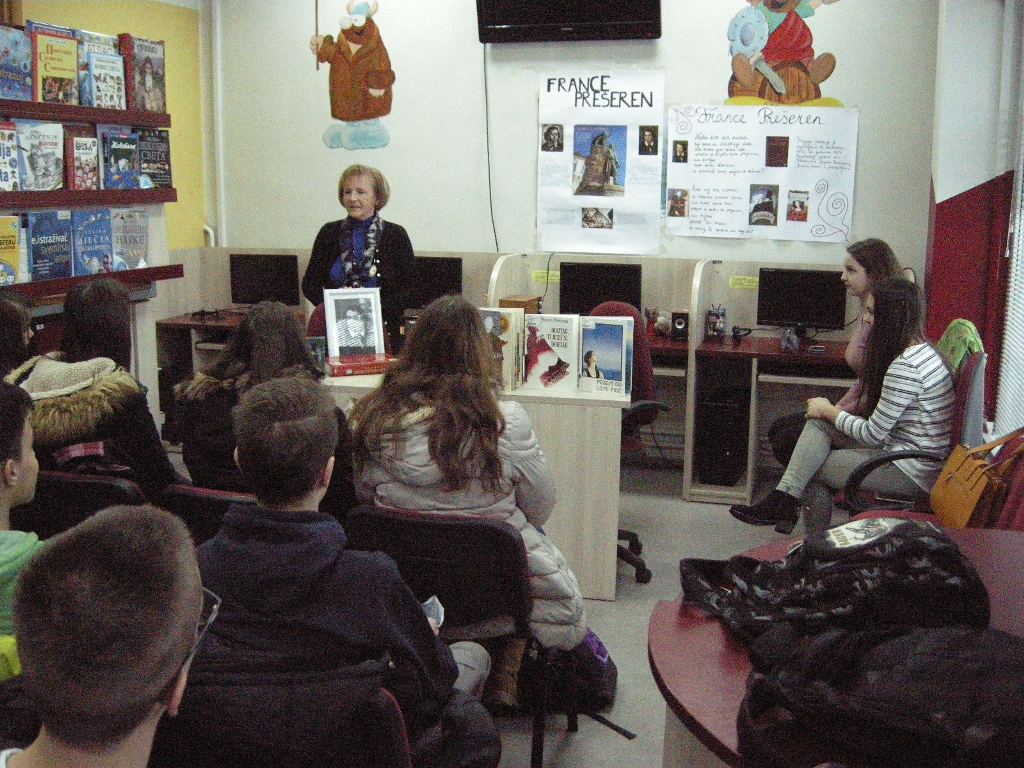 Februar je mjesec kulture, te smo zato odlučili da govorimo o Francu Prešernu. U petak, 23. februara, su u bibliotkeu došli učenici 9. razreda Osnovne škole Branko Ćopić. Učenike su pozdravili Aleksandra Čvorović i predstavnica Udruženja Slovenaca Triglav Marija Petković. O Prešernovom životu je govorila Iva Potkonjak, a njegov rad je predstavila Aleksandra Špehar. Barbara Hanuš je pročitala pjesmu Zdravljica na slovenačkom jeziku, a Aleksandra Špehar prevod pjesme na srpskom jeziku. Učenici su dobili radni list i pokazalo se da nisu imali problema pri rješavanju. Postavili smo im i nekoliko pitanja i brzo smo čuli pravilne odgovore. Njihovo razumijevanje slovenačkog jezika smo provjerili tako da su nakon slušanja pjesme Povodni mož ispričali priču Urške i podvodnog čovjeka. Da li je Urška preživjela? Gdje je živjela sa podvodnim čovjekom? Sve to smo izveli u zadnjem dijelu časa kada su učenici rekli kako zamišljaju nastavak pjesme. Nasmijali smo se njihovim originalnim zamislima.