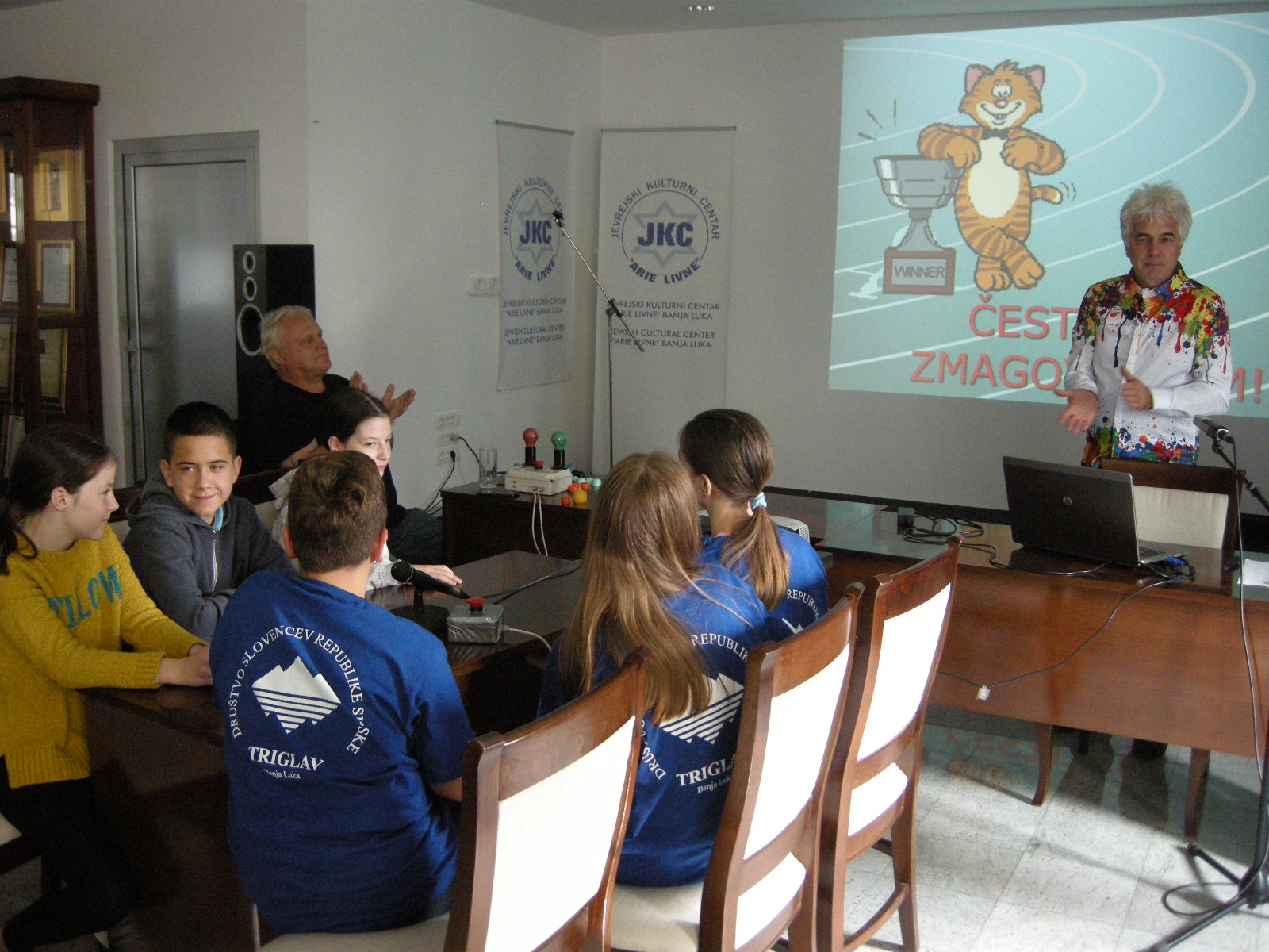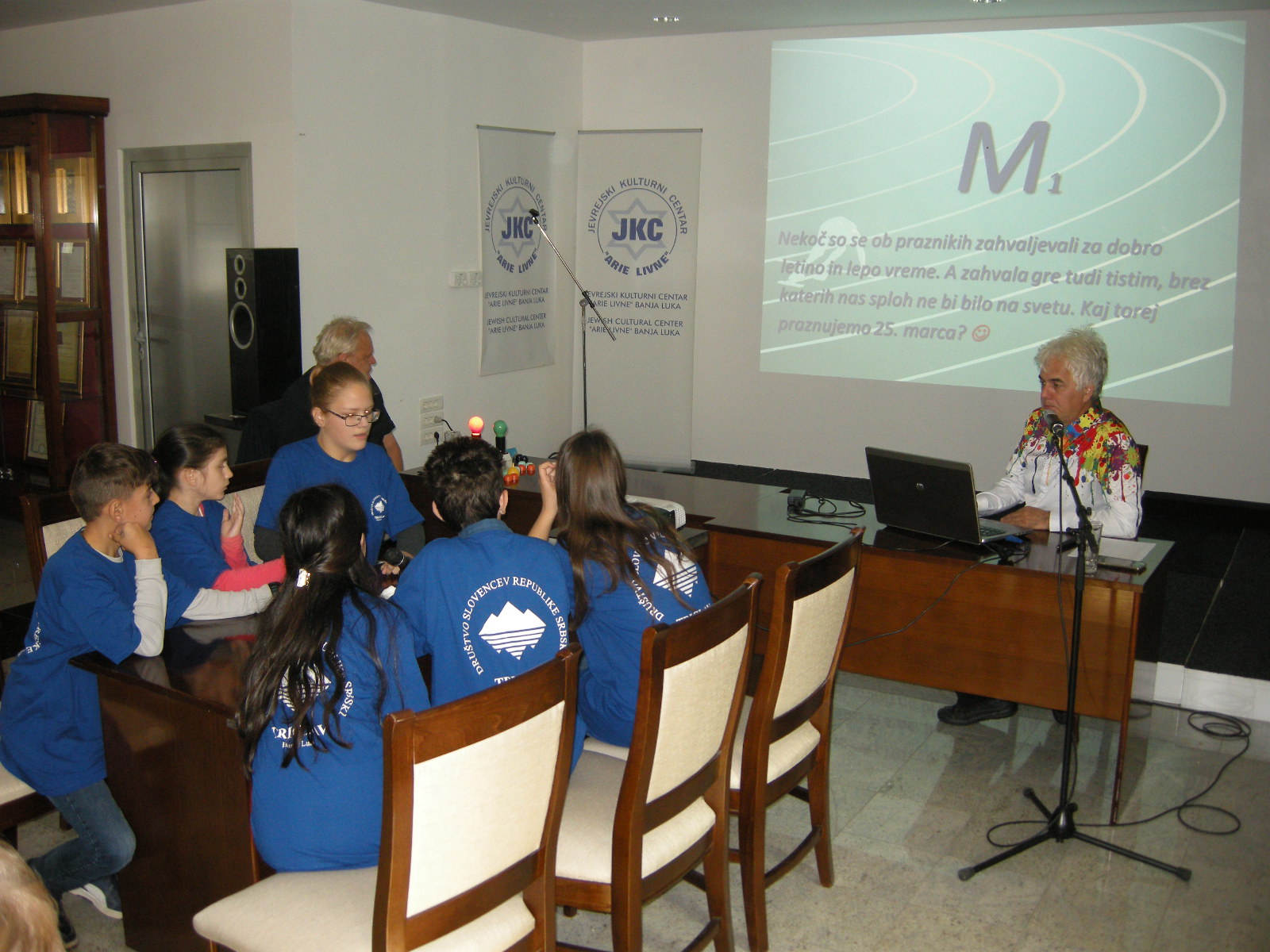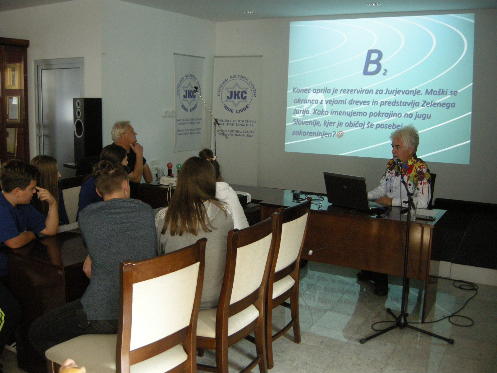 Svoje znanje smo pokazali na kvizu, koji je organizovan u Banjaluci, u subotu, 20. oktobra. To je bio već šesti kviz za učenike dodatne nastave slovenačkog jezika iz cijele Bosne i Hercegovine. Učenicima iz Sarajeva, Zenice, Kaknja, Tuzle, Teslića, Slatine i Banjaluke su se pridružila dva učenika iz Niša. Okupili smo se u Jevrejskom kulturnom centru, a proveli prijatno prijepodne odgovarajući na zanimljiva pitanja. Pobijedila je ekipa iz Tuzle. Slušaoci su napunili dvoranu i saznali mnogo novoga.