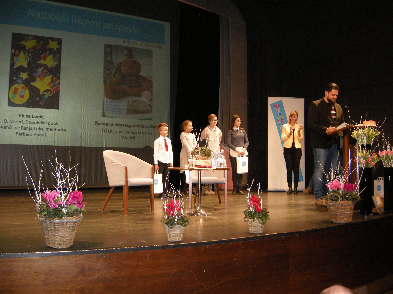 Nagrade su uručili 29. januara na svečanom otvaranju omladinskog literarnog festivala »Bralnice pod slamnikom« u Kulturnom domu Franca Bernika u Domžalama. Priredbu je vodio Boštjan Gorenc Pižama, a svoju poeziju su čitali Saša Pavček, Peter Svetina i Feri Lainšček. Udaljenost od Slovenije nagrađenim učenicama nije spriječila put u Domžale. Elena Lunić i Aleksandra Špehar su zajedno sa Aleksandrinim ocem, predsjednicom Udruženja Slovenaca Triglav Marijom Grbić i mentoricom Barbarom Hanuš prisustvovali priredbi. Primili su brojne čestitke. Bravo, mladi stvaraoci!