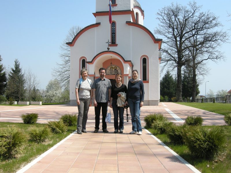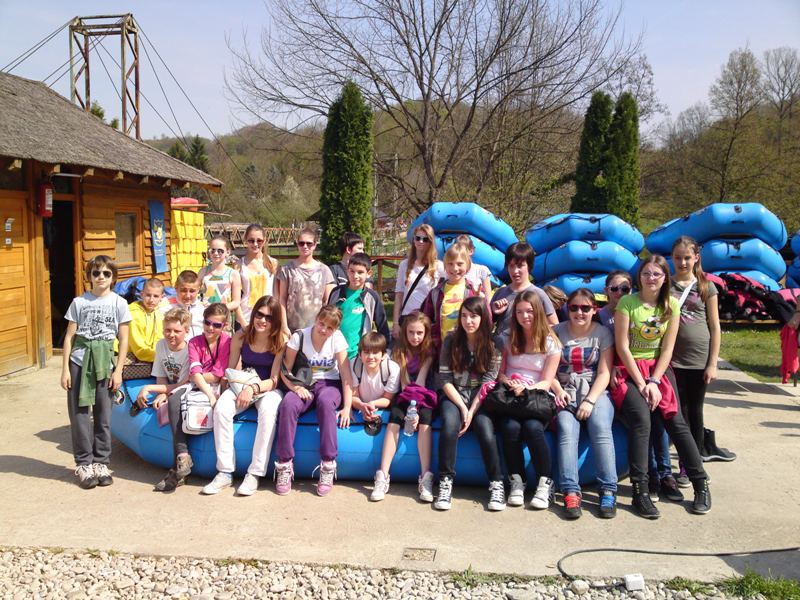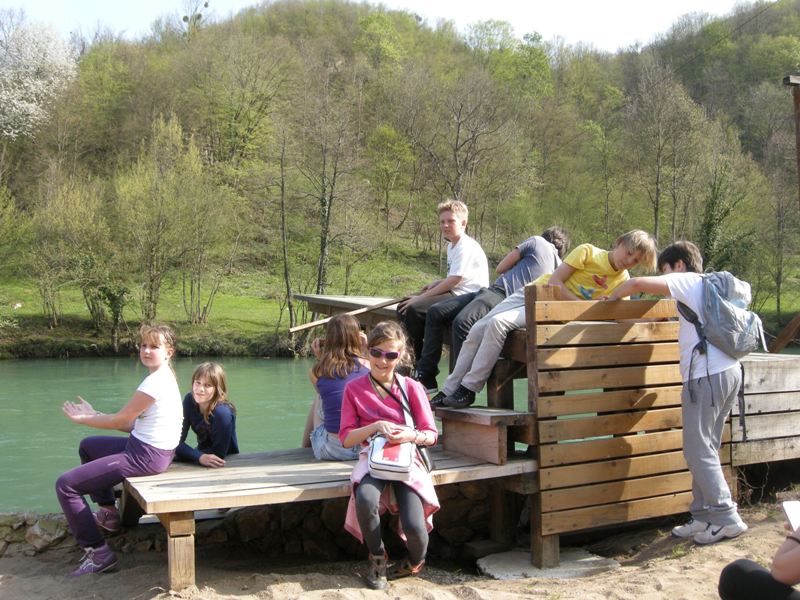 In the afternoon we went for a tour of Banja Luka, while in the evening they stayed at the families of our students. On Saturday, 20 April, we all went to excursion. We visited Equestrian Club Čokorska polja. We heard something about horses and students tried riding a horse. We continued to the rafting centre, by the Vrbas River. We also heard something about the centre there and they also prepared a tasty lunch. The Vrbas River has got incredibly green colour which reminds of the Soča River. It was quite pleasant to sit on the riverbank for a while before returning to the city. On Sunday, 21 April, it was time to part. On the way home the guests visited Slatina, while Mina and Brina, who stayed at their peers in Slatina, waited for us there. We found out how many Slovenians moved to this beautiful healing place and saw the source of health water. The way we started our socialising with tasty ćevapi we also ended it in that way.