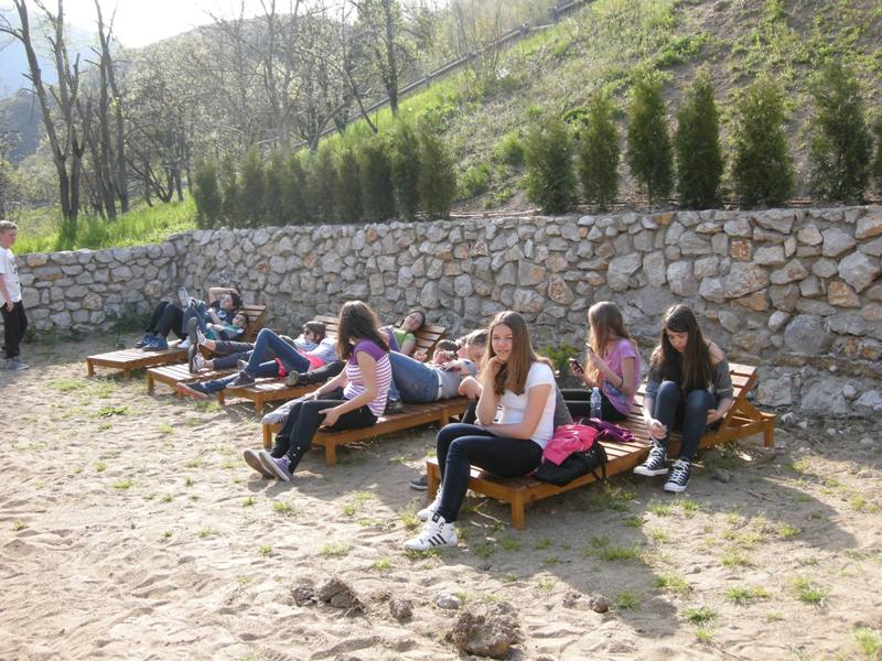 In the afternoon we went for a tour of Banja Luka, while in the evening they stayed at the families of our students. On Saturday, 20 April, we all went to excursion. We visited Equestrian Club Čokorska polja. We heard something about horses and students tried riding a horse. We continued to the rafting centre, by the Vrbas River. We also heard something about the centre there and they also prepared a tasty lunch. The Vrbas River has got incredibly green colour which reminds of the Soča River. It was quite pleasant to sit on the riverbank for a while before returning to the city. On Sunday, 21 April, it was time to part. On the way home the guests visited Slatina, while Mina and Brina, who stayed at their peers in Slatina, waited for us there. We found out how many Slovenians moved to this beautiful healing place and saw the source of health water. The way we started our socialising with tasty ćevapi we also ended it in that way.