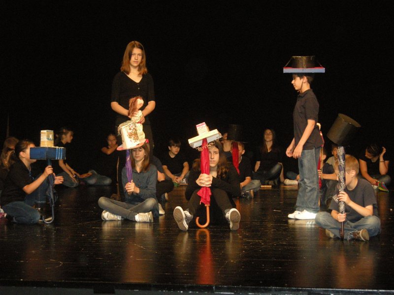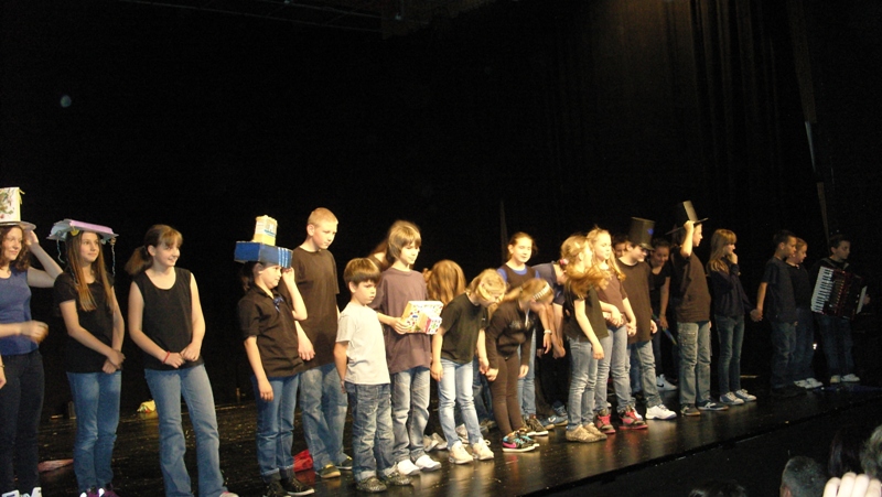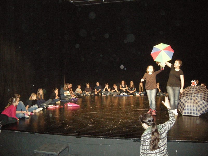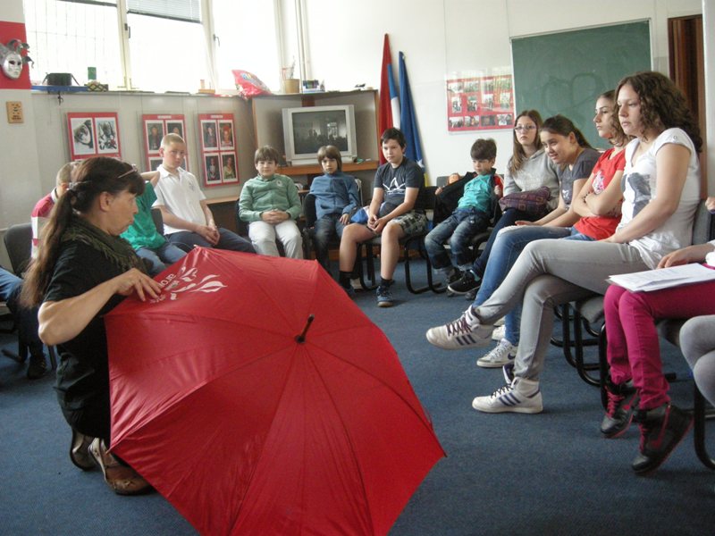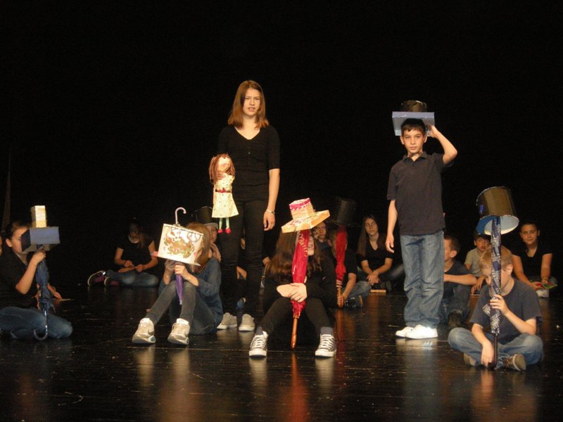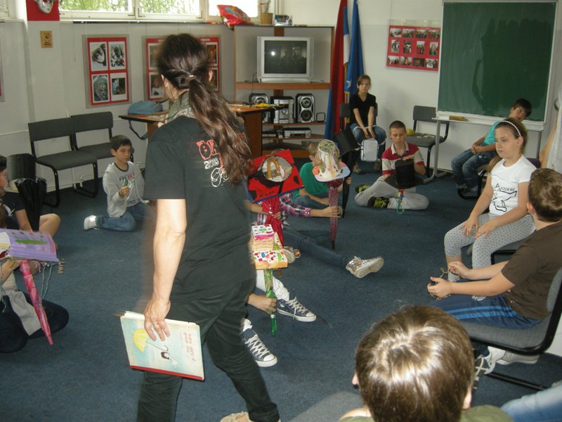 On Friday, they were making masks and puppets the whole day, on Saturday the decided on the roles and practiced and on Sunday they already showed results of their work. A performance “A balloon can also be my umbrella” resulted from the workshop, while children played it to audience who filled in theatre Jazavac. A fairytale by Ela Peroci took us to the Land of Hats. More than 30 children made a performance accompanied by music – one could hear sounds of accordion, guitar and violin. Photographs can tell more than words although it is rather difficult to describe what the children had to make and learn in order to make the performance.