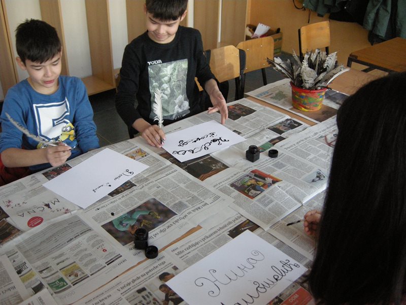 Curators of the Gorenjska Museum Kranj Anja Poštrak and Barbara Kalan were with us. Three workshops for children and youth were organized at the Elementary School “G. S. Rakovski”. Students wrote with a goose feather, painted pictures of clothes from the romantic period and posted scenes from Prešeren's life around the place on the map of Gorenjska (birth house, Prešeren Theatre, Prešeren Grove, Prešeren Square...).