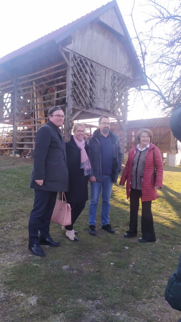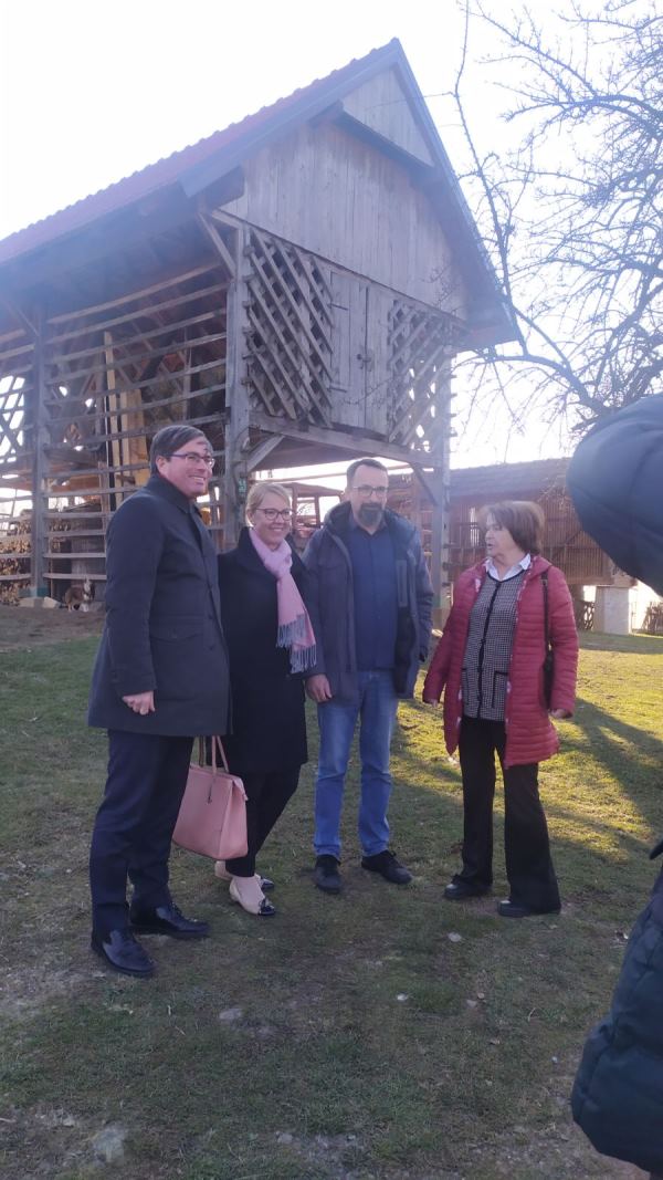 Our meeting in Slatina was cordial and spontaneous. Everything went according to plan, there was no shortage of television, either. There was also journalist Dušan Tomažič, who records and talks about many Slovenian associations outside of Slovenia. A member of our association, Mladen Lunić, explained the history of Slatina while they were visiting Slatina. He spoke about the Štrekelj family, the Adamič family, who made a great contribution to the development of Slatina. Today, Slatina is a leader in agriculture and fruit growing. Natural healing springs have included Slatina in the eminent spa rehabilitation centers. Slatina is developing its tourism and wishes to become part of modern rural tourism. Lunić's household, which built the only SLOVENIAN KOZOLEC in Bosnia and Herzegovina, wants to have a part of this tourism. Together with the minister, the guests toured kozolec, where they discussed preparations for the celebration of the 100th anniversary of the arrival of Slovenians in this place. There we refreshed ourselves and rested a little. A lunch was prepared for all those present, in which there was plenty of everything. Mrs. Lunić is a descendant of Slovenians and has not forgotten how her mother used to make bread of Bela Krajina.