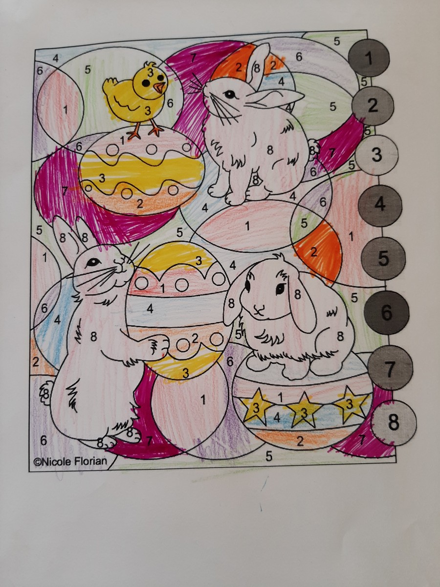 We learned about the symbols of Easter: Easter eggs (pirhi) - a symbol of the resurrection or drops of blood, horseradish - nails, potica (strudel) - a crown of thorns, Easter ham - the body of Christ. We watched a video of how Ljubljana butarica is made and how Slovenians celebrate Easter. The students watched the Easter customs in Slovenia via the Internet (cutting the eggs), made an Easter rabbit out of cardboard, and at the end of the class they had sweets - a chocolate egg and a chocolate bunny. The youngest children painted an Easter colouring book.