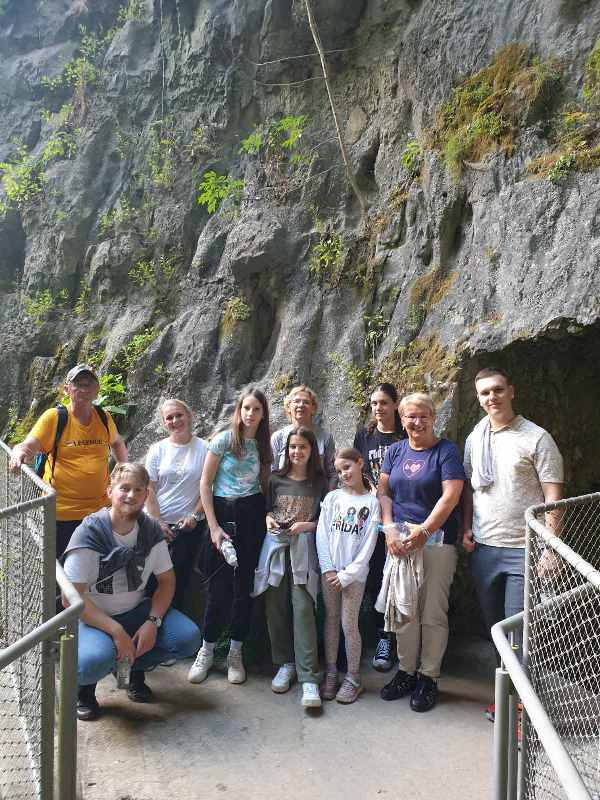 Some of the participants in the program who came from further afield, including representatives of our Association, were accommodated in the beautifully decorated building of the Student's Home, which is part of the Catholic General High School in Vipava. Our members used Sunday, the second day of their stay, for a short tour of the old part of the town of Vipava, followed immediately by the departure for the municipality of Divača, which is located about 30 kilometers to the south. The goal was a visit to the Škocjan Cave Park and a tour of one of the largest and most organized speleological facilities in the world. The Škocjan Caves are on the UNESCO World Natural Heritage List. It has been visited by organized tourists for over 100 years, and was thoroughly renovated 20 years ago and attracts numerous visitors from all over the world. The river Reka flows through the cave, which has one of the deepest underground canyons, above which visitors have the opportunity to move on excellently arranged and safe paths.