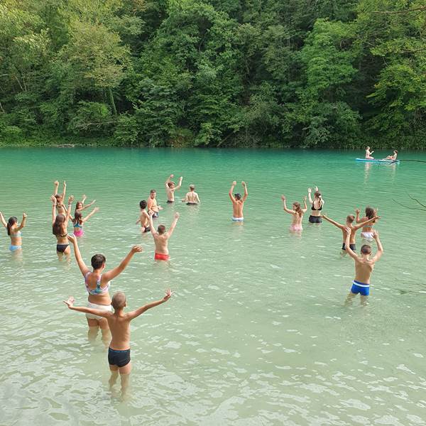 The children were from 15 countries. They had active learning in the morning and a relaxing program in the afternoon. For example, they tested how cold the Soča river is, and if they wanted to move around and socialize, they would go to the nearby playground. As the weather was bad in Slovenia that week, the rain drove them indoors, so they used the time to meet the permanent residents of the Soča home: the snakes Marko and Pepi and the lizard Gomez. They were also very hard-working mountaineers - they enjoyed the beds of the Tolminka and Zadlaščica rivers. Soča is always beautiful, even when its color is not emerald and does not shine. As this day was not suitable for swimming, they tried their hand at throwing frogs. A rainy afternoon is perfect for creative workshops. They learned the tying technique - macrame, made a friendship bracelet and a gift box. The Soča River did not allow them to raft down it as planned, so they learned a lot about water sports and went to see it one last time in its wild form.