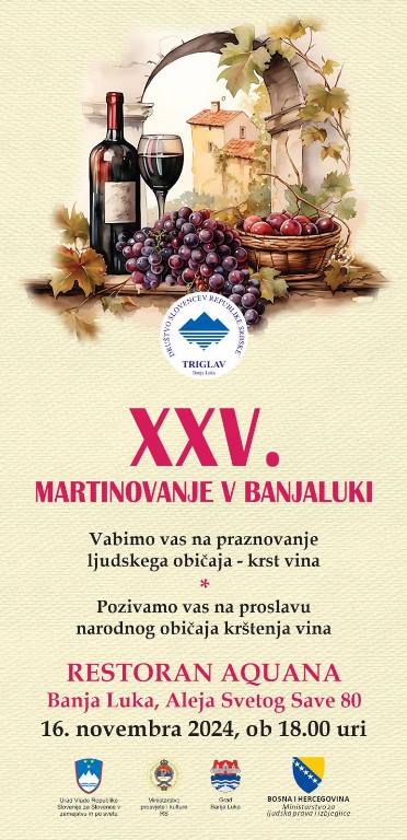 In the program part of the event, the mixed choir "Davorin Jenko" performed two songs under the conductorship of Vanja Topić-Vještica. After the choir, a children's folklore group with choreographer Predrag Savić performed Gorenjska dances and received great applause from the audience. Since Martin's Day is a traditional Slovenian event, dedicated to Saint Martin, the patron saint of vineyards and winegrowers, the traditional baptism of wine was performed in a humorous manner by a long-time friend of the Association, Peter Kirič from Ormož, with the help of winegrower Miran Trop and his son. Then, everyone present was entertained by a musical duo brought from Novo Mesto by Branka Bukovec from the Association for the Development of Voluntary Work. We celebrated this traditional event in a good atmosphere with dancing and pleasant company with traditional Slovenian autumn food. This year, we were joined by Nevena Blagojević – Podrić, the Head of the Department for Culture, Social Welfare, Citizens' Associations and Religious Communities with associates from the City of Banja Luka, Miha Vilar, Consul from the Consular Office of the Embassy of Slovenia in Bosnia and Herzegovina, Novo mesto, Igor Kotjelnikov from the Ministry of Education and Culture of the Republic of Srpska, Ženja Simonič from the Slovenian Emigrants' Association, Metoda Perger, the new Slovenian language teacher in Banja Luka and Prijedor, representatives of national minority associations of the City of Banja Luka, representatives of Slovenian associations from Bosnia and Herzegovina and numerous members of the Association. The event was organised with the financial support of the Office of the Government of the Republic of Slovenia for Slovenians Worldwide, the City of Banja Luka, the Ministry of Education and Culture of the Republika Srpska and the Ministry for Human Rights and Refugees of BiH, and sponsors.