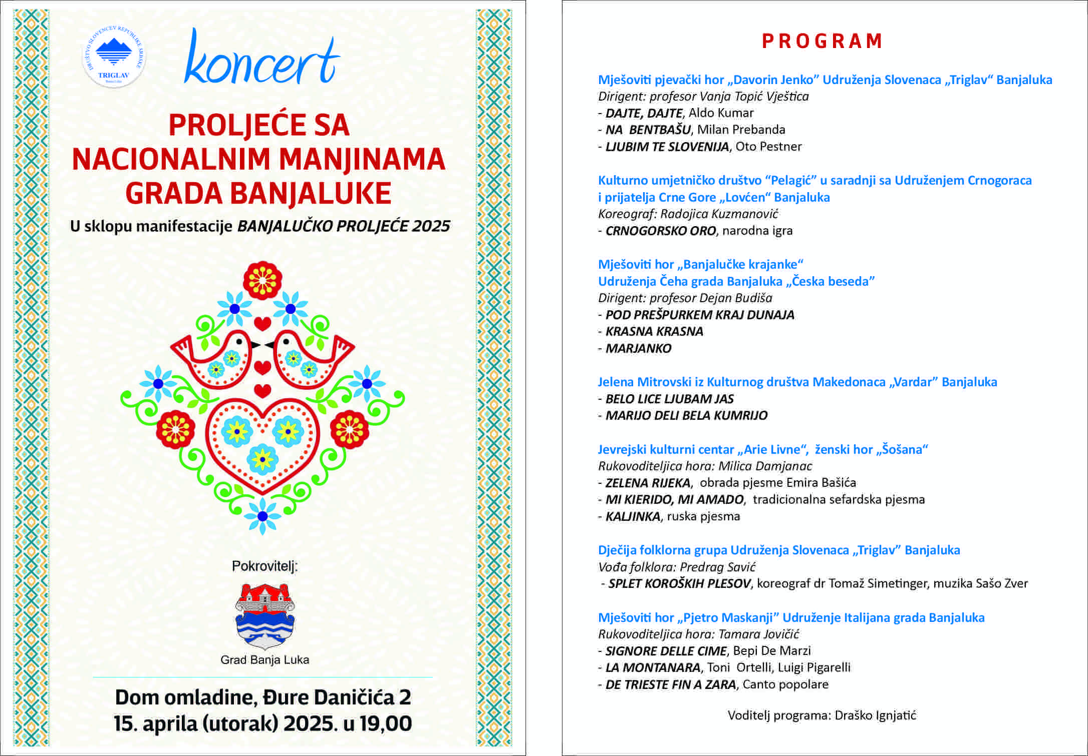 On Tuesday, April 15, as part of the 2025 Banja Luka Spring event, the concert Spring with National Minorities of the City of Banja Luka was held at the Youth Center.