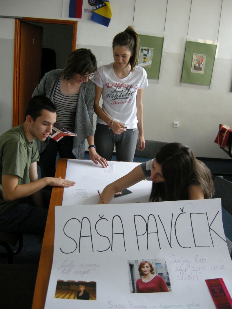 At the supply teaching lessons we were preparing for her visit. The adults read interviews and listened to her interpretation of own poems on CD Dress me in a Kiss. The youngest learned about her fairy-tale Why is the field a lake. Pupils and students prepared posters expressing their view of creativity of Saša Pavček. They looked at her books and interviews, and then they wrote, drew, painted, cut, glued… Posters will wait for the artist on Saturday at the National Minorities’ Club while the photographs show how impressed pupils and students were during their work.