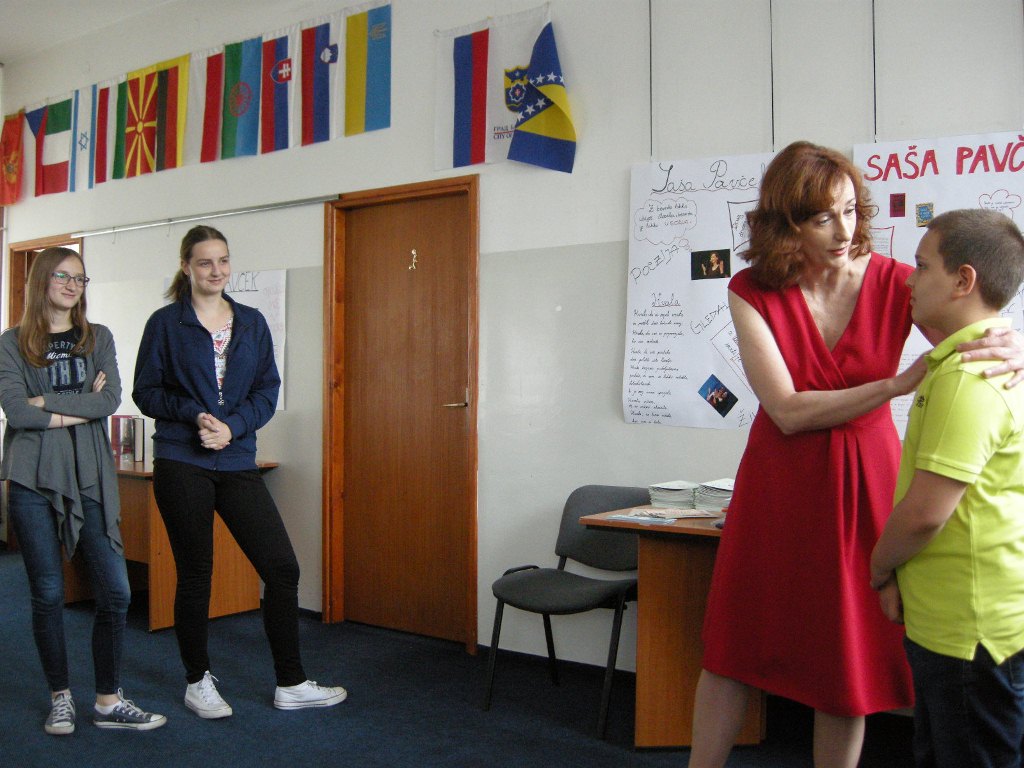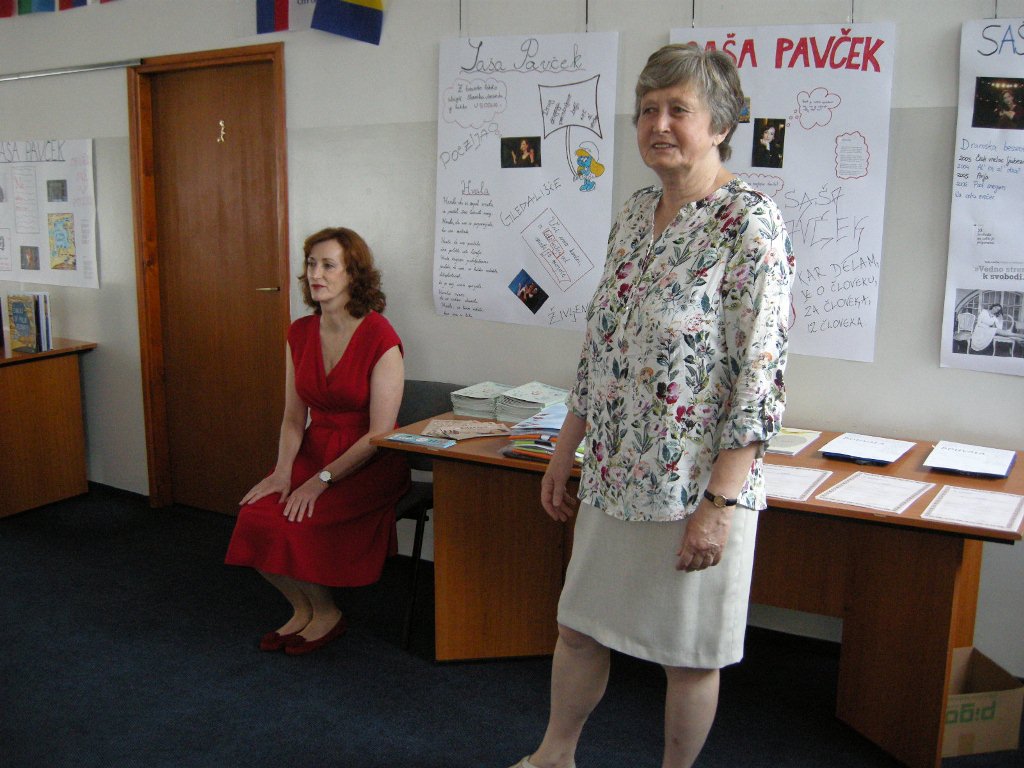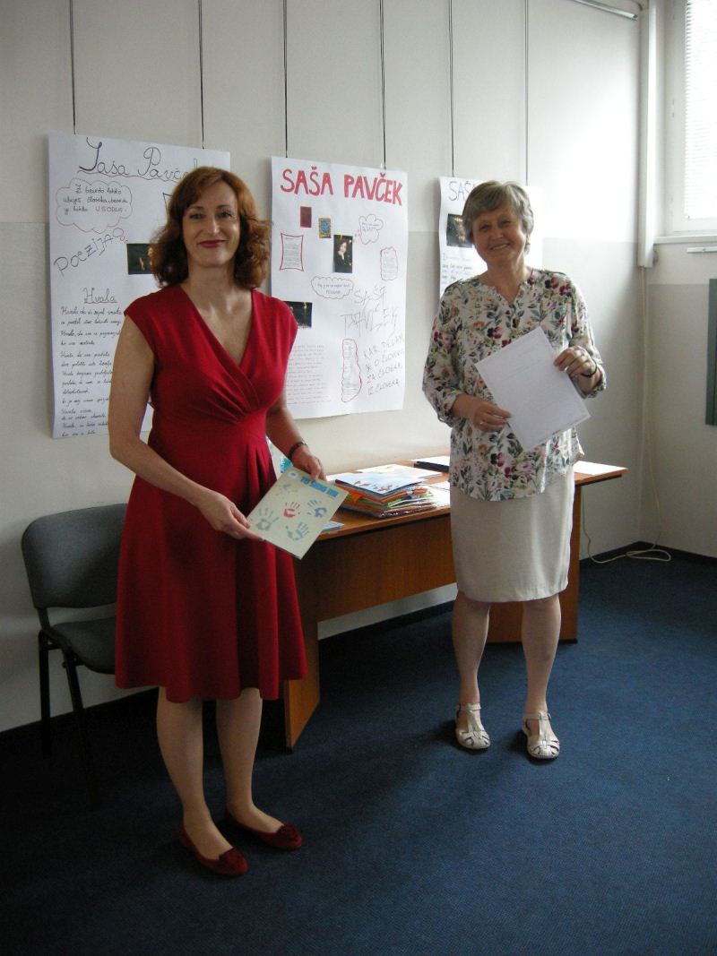 Saša Pavček teaches at the Academy for Theatre, Radio, Film and TV, and she clearly presented to pupils her pedagogical work. She spoke about her writing, and then it was the time to award certificates. The youngest pupils deserved special praise for regular attendance and active learning. Three acknowledgments were awarded for regular attendance: Aleksandra Špehar and Elena Lunić did not miss a single class, while Viktor Perušić was the boy who most often attended classes. Reader's badge this year went to Nikša Perušić and Aleksandra Špehar, and they also received acknowledgement and books. Nikša Perušić and Jelena Sibinović received acknowledgement and book award of the City Library of Ljubljana, where their art works had been selected among top ten at the competition Underwater World.