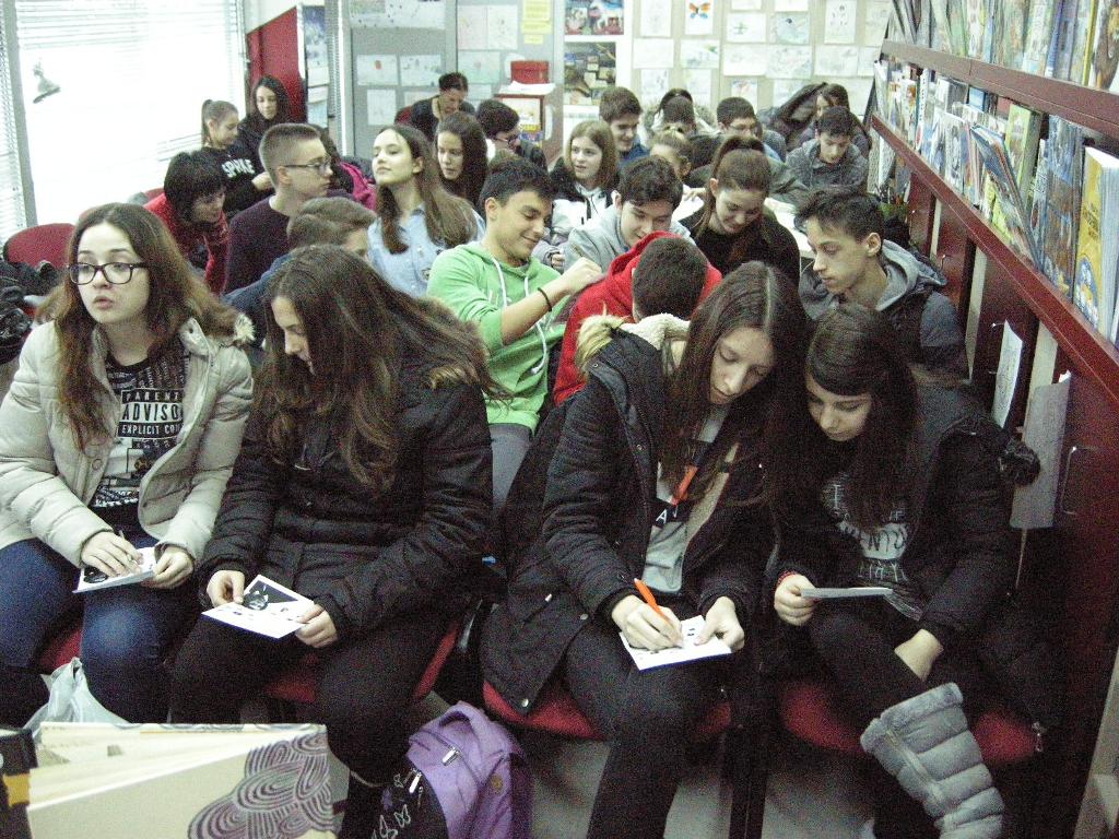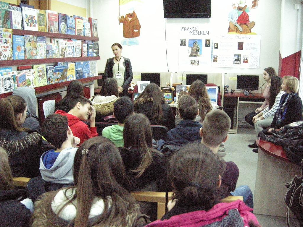 February is the month of culture, and we therefore decided to talk about France Prešeren. On Friday, 23 February, the library hosted pupils of 9th grade of Elementary School Branko Ćopić. Pupils were greeted by Aleksandra Čvorović and a representative of the Association of Slovenians Triglav Marija Petković. Iva Potkonjak spoke about the life of France Prešeren, while his work was presented by Aleksandra Špehar. Barbara Hanuš read poem Zdravljica in Slovenian, while Aleksandra Špehar read the translation into Serbian. Pupils and students got their working sheets and it turned out they did not have problems in solving. We asked them several questions and promptly heard proper answers. We checked their understanding of Slovenian by asking them to tell us the story of Urška and vodyanoy after they had heard the poem Vodyanoy. Did Urška survive? Where did she live with the vodyanoy? We did all that in the last part of the lesson when pupils said how they imagined the continuation of the poem. We all laughed at their original ideas.