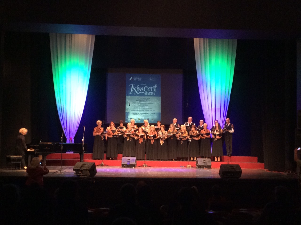 The event was hosted by women choir “Slovenčice” and the guests, beside our choir, were mixed choir “Kredarica” from Novi Sad, women choir “Ajda” from Umag and mixed choir “Camerata Slovenica” from Sarajevo. All choirs sang three songs each. The audience could enjoy Slovenian songs, while some of our members also danced. The Waltz with jolly Zabavljivka was greatly welcomed by the audience. The concert ended by all choirs singing together “Tam sem jaz doma” under the conducting of Fuad Šetić from Sarajevo.