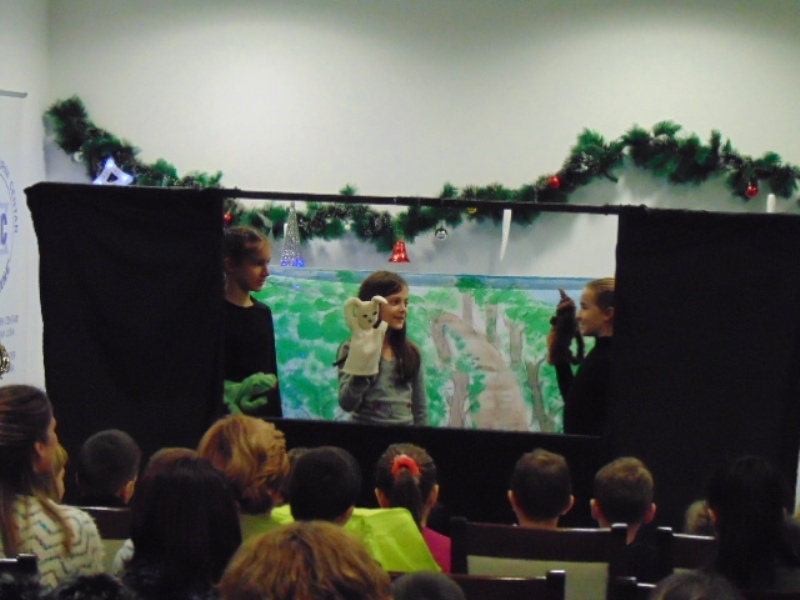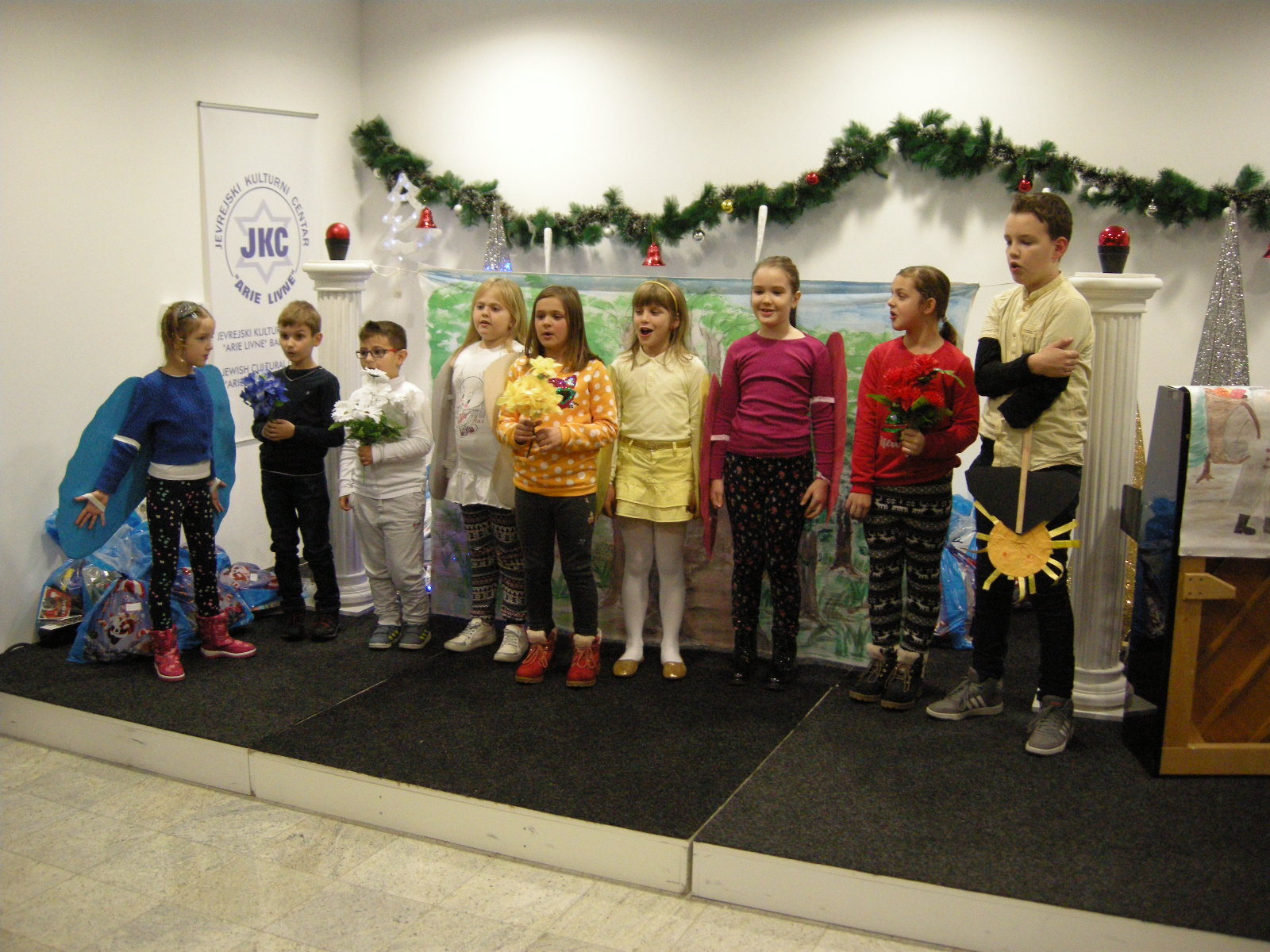 On Friday, 14 December, it was snowing the whole day. Children waited for them in Jewish Cultural Centre. Melody of saxophone played by Jovan Dimitrijević, marked the start of the event. Programme was presented by Elena Lunić. The first to perform were three pupils from Slatina. They played a puppet play A Rabbit Got Lost. Then followed our youngest pupils. Although they started learning Slovenian this school year they were brave enough to get to the stage. Butterflies, flowers, the sun and cloud were in the Four Butterflies. Pupils attending classes on Saturdays played a fairy tale How Ana and Bojan travelled to the city or You can never please everyone. After the programme we called for Santa Claus. He did not come alone but in the company of Father Christmas and with a basket full of presents. Those are the moments that children always remember and to remind them of magical time of childhood.