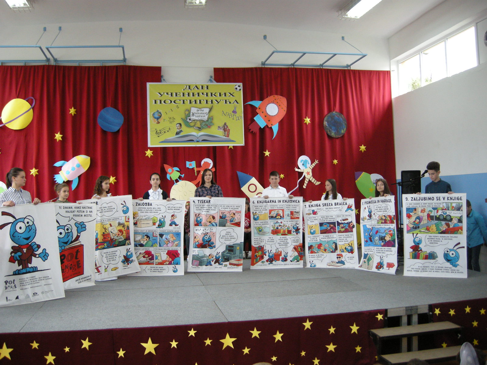 Pupils showing what they have learned include also pupils of supply teaching lessons of Slovenian. This year, they introduced the book project to their peers. The host of the project, implemented by the Slovenian Book Agency, was the Association of Slovenians Triglav in Banja Luka back in February. We liked the book moth so much teaching us how to make a book, that we borrowed posters again. The students presented the process of making the book, discussed the role of the author, the publishing house, the printing press, as well as all those who ensure that the book reaches the reader. If no one reads it, the book is just a subject, and that's why the role of libraries and bookstores is huge. Teachers want pupils and students to fall in love with books. A nice tale of a book moth, written by Žiga X. Gombač and illustrated by David Krančan, helps us promote reading. The students of the supply teaching lessons of Slovenian invited their peers to visit the bibliobus, which is the first library-bus in Bosnia and Herzegovina. The position is in front of the Primary School “Holandija”. The moth says, "Those who read, strengthen their vocabulary, and with each page read, we learn something new and we are never bored." and all of us who attended the event listened to the pupils of Primary School “Holandija” because the program was excellent.