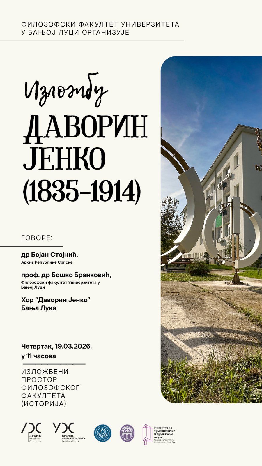 U izložbenom prostoru Filozofskog fakulteta Univerziteta u Banjoj Luci 19. marta 2026. godine otvorena je izložba posvećena istaknutom kompozitoru i dirigentu Davorinu Jenku.