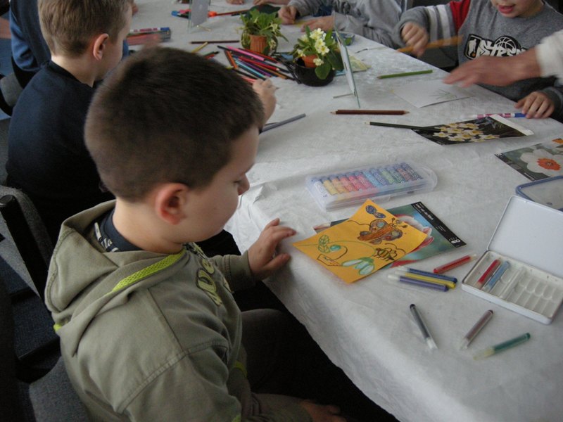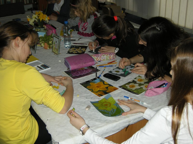 Spomladi se narava prebuja. V vseh kulturah ima to obdobje velik pomen. Velika noč, največji in najstarejši krščanski praznik, je hkrati tudi praznik pomladi in hvalnica novemu življenju. Učenci dopolnilnega pouka slovenščine iz Banjaluke in Slatine so na ustvarjalnih delavnicah izdelovali to, na kar ob besedi pomlad običajno pomislimo. Prve asociacije so povezane s cvetlicami. Viktor je prinesel narcise in trobentice in vsak otrok je naslikal svojo sliko z motivom pomladnih rož. Slike so dali v okvir. To delavnico je vodila Alenka, Vikijeva in Nikševa mama.