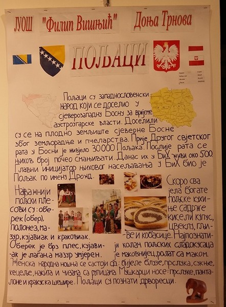 Izložba obuhvata 16 ručno rađenih kreativnih panoa, a svaki predstavlja po jednu nacionalnu manjinu kroz različite segmente - istorija, umjetnost, kultura i dr. Do kraja decembra 2015. godine, ista izložba će biti upriličena i u Ministarstvu prosvjete i kulture Republike Srpske, a povodom posjete pobjedničkih ekipa, ovog takmičenja, Banjoj Luci. Jedan od mnogobrojnih radova je i naš plakat.