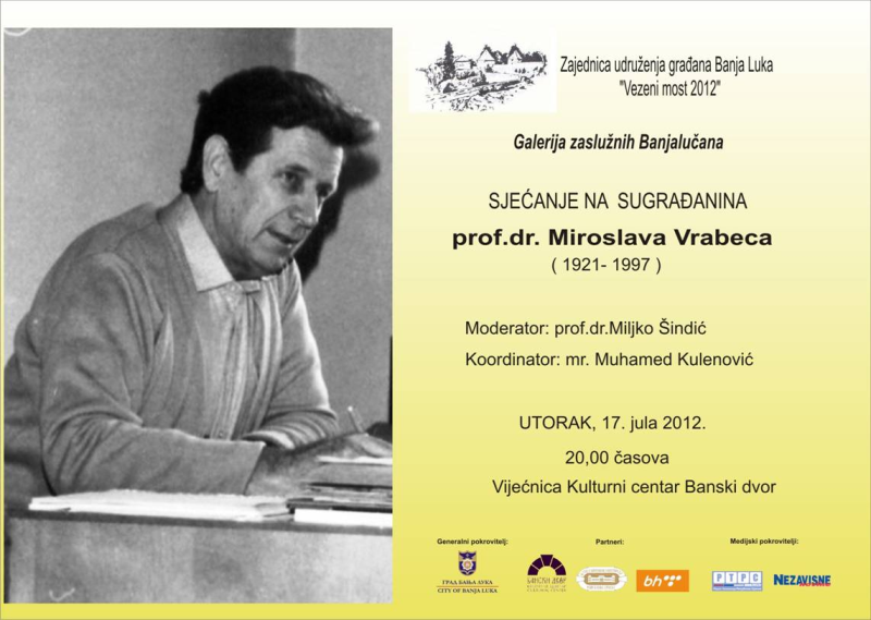 U okviru manifestacije poznate pod imenom „Vezeni most“, koja se već devetu godinu pod generalnim pokroviteljstvom Grada Banja Luka, održava u Banjoj Luci, sredinom jula 2012, u Vijećnici Banskog dvora održan je omaž istaknutom profesoru dr Miroslavu Vrabecu (1921 – 1997).