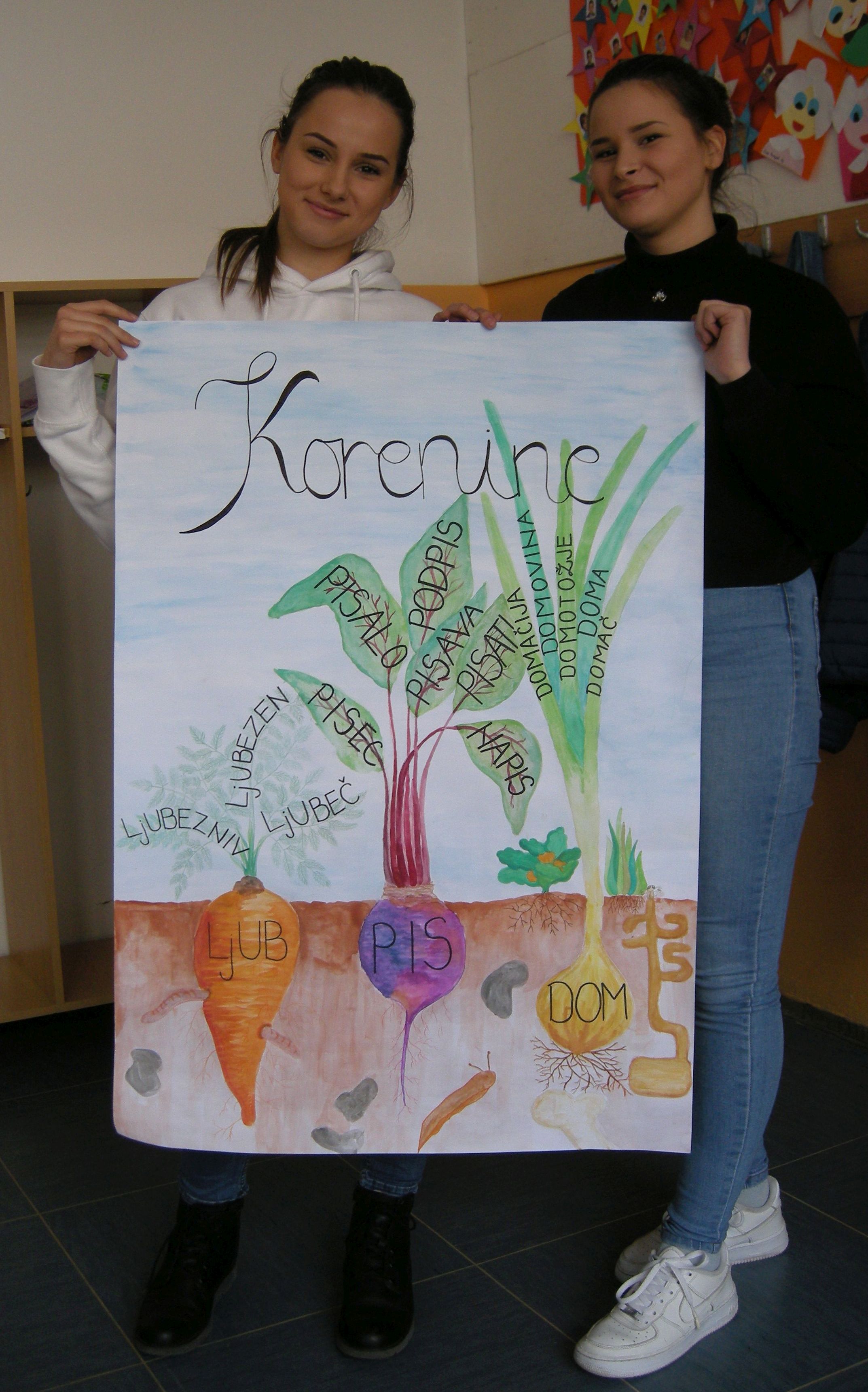 plakatni natečaj na temo Slovenščina - moj, tvoj, vaš jezik, ki so ga razpisali že v začetku lanskega leta. Na natečajih Slavističnega društva Dolenjske in Bele krajine učenci dopolnilnega pouka slovenščine redno sodelujemo in tudi zdaj smo. Spet smo se razveselili nagrade – za plakat Korenine besed sta jo prejeli Mihaela in Elena Lunić. Vsi učenci so prejeli zahvale za sodelovanje.