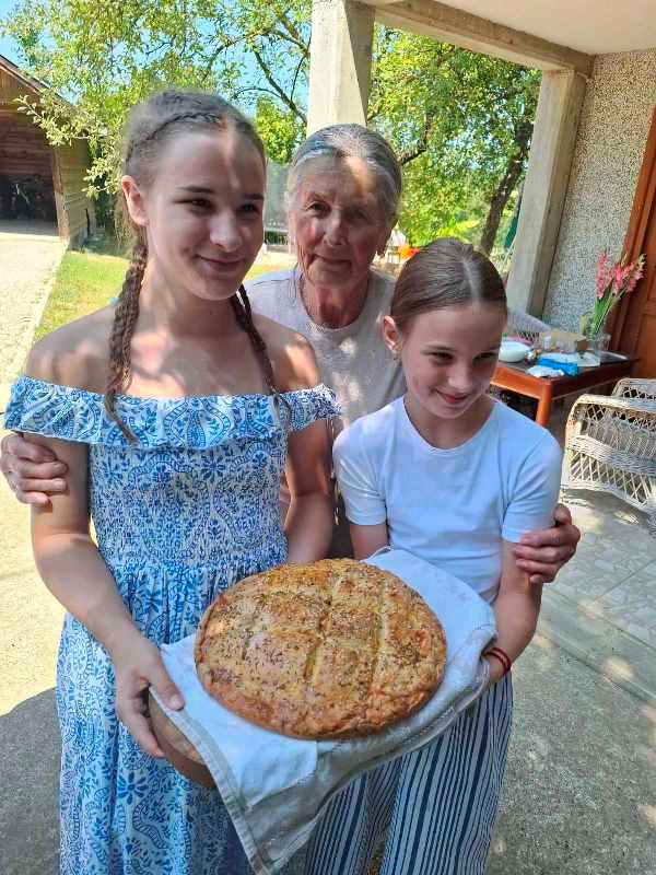 8. Belokranjska pogača, mineštra pri babici Dragici in vnukinjah Katji ter Nastji Lunić in Ivanu Memonu - spominski pohod Za Marijo - slatinsko posestvo Lunić (julij 2025)