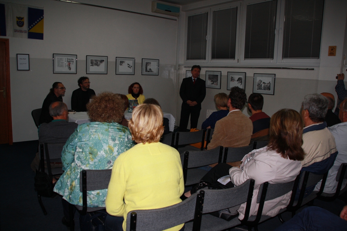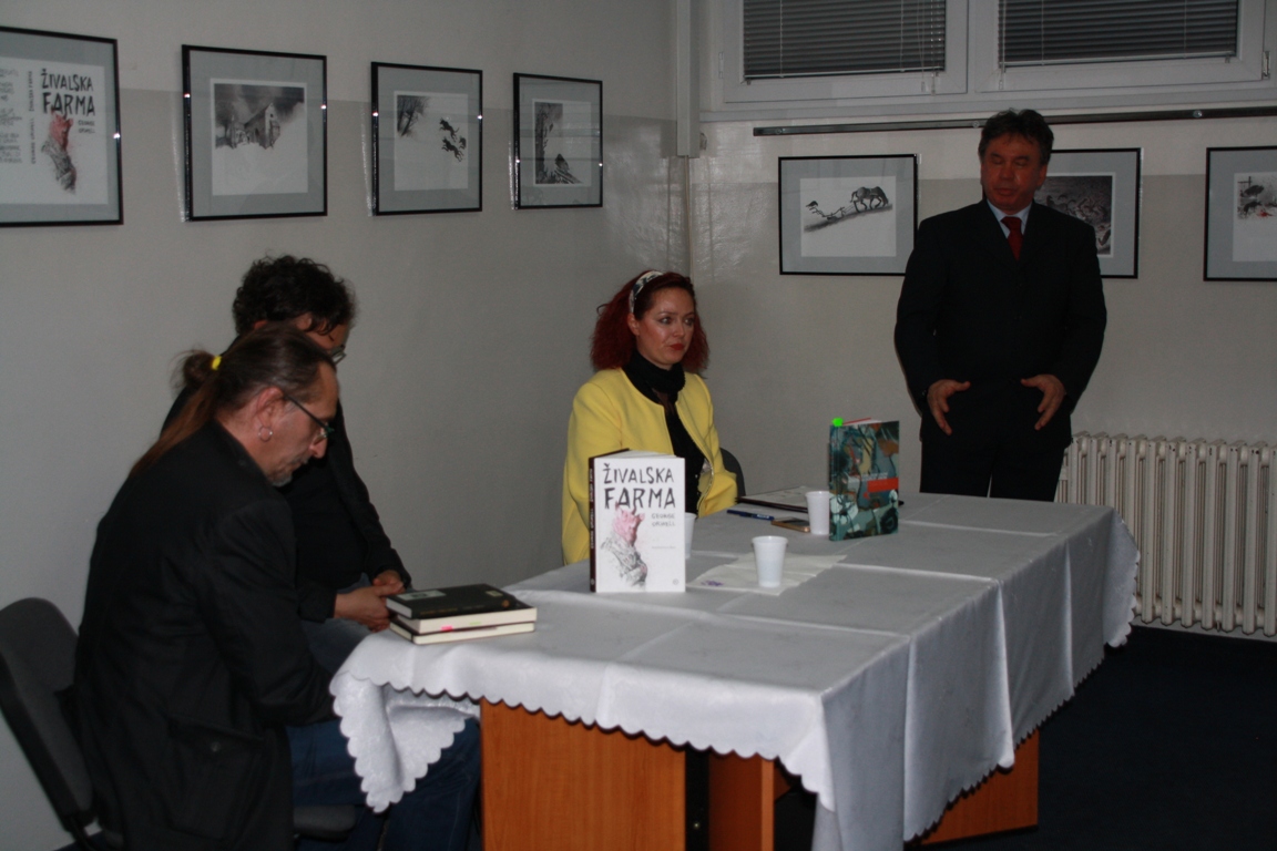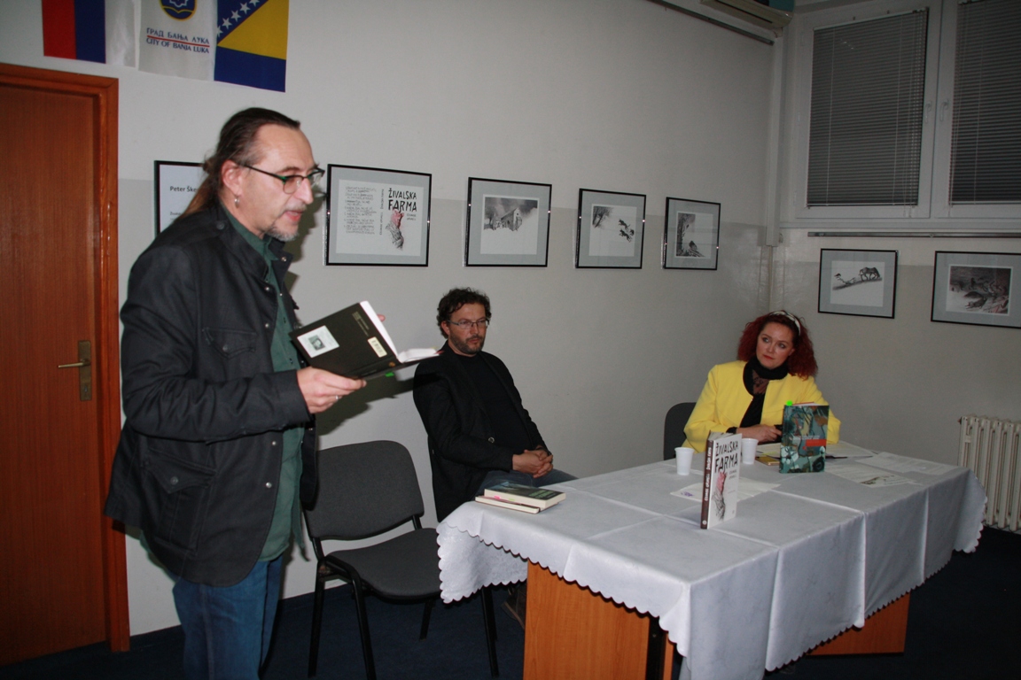 V pogovoru z obema avtorjema smo se tako seznanili s poezijo in proznim ustvarjanjem Sama Dražumeriča in slikovitim opusom večkrat nagrajenega ilustratorja Petra Škerla. V manjši razpravi, ki se je ob tem razvila smo se pogovarjali o pomenu slovenskega jezika, njegovi vlogi danes in skrbi zanj. V prostoru kluba so bile na ogled tudi črnobele ilustracije Petra Škerla nastale po romanu Georga Orwella Živalska farma. Močne in zgovorne podobe s katerimi je ilustrator odlično upodobil satirično alegorijo enega najpomembnejših družbenih vizionarjev 20. stoletja.