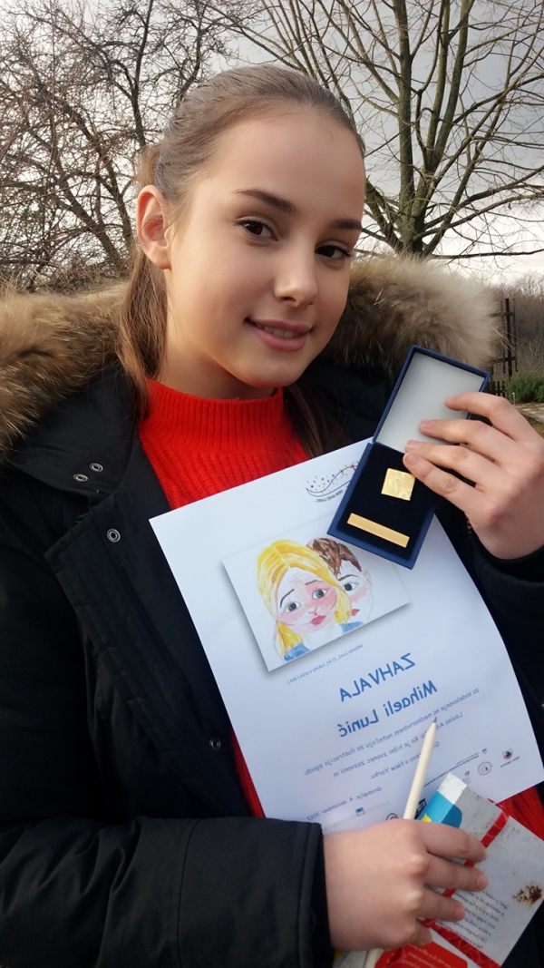Na zahvalah je ilustracija naše učenke Mihaele Lunić, ki je prejela nagrado za svoje delo Lačne oči. Mihaela se je razveselila lepe značke in knjižnega darila. Učenci dopolnilnega pouka slovenščine v Republiki Srbski zelo radi ustvarjajo in se že veselijo naslednjega likovnega natečaja.