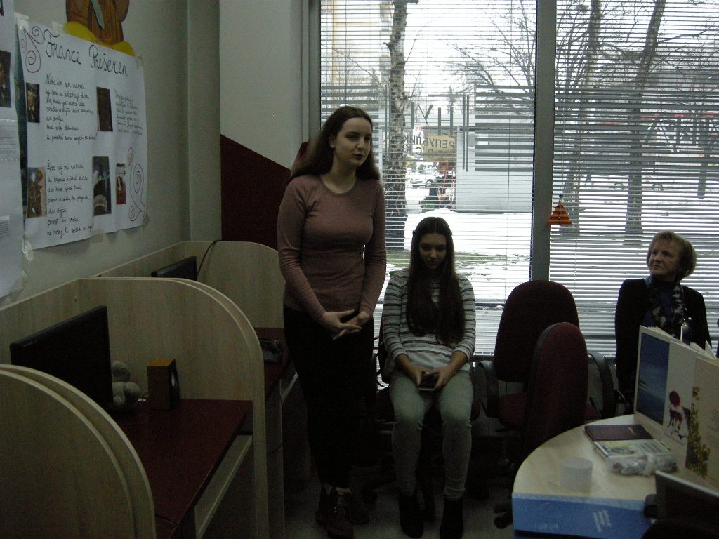 Februar je mesec kulture, zato smo se odločili, da spregovorimo o Francetu Prešernu. V petek, 23. februarja, so v knjižnico prišli učenci 9. razreda Osnovne šole Branko Čopić. Učence sta pozdravili Aleksandra Čvorović in predstavnica Društva Slovencev Triglav Marija Petković. O Prešernovem življenju je govorila Iva Potkonjak, njegovo delo pa je predstavila Aleksandra Špehar. Barbara Hanuš je prebrala pesem Zdravljica v slovenščini, Aleksandra Špehar pa prevod pesmi v srbščini. Učenci so dobili delovni list in pokazalo se je, da niso imeli težav pri reševanju. Zastavili smo jim tudi nekaj vprašanj in hitro smo slišali pravilne odgovore. Njihovo razumevanje slovenščine smo preskusili tako, da so po poslušanju pesmi Povodni mož povedali zgodbo Urške in povodnega moža. Je Urška preživela? Kje sta s povodnim možem živela? Vse to smo izvedeli v zadnjem delu ure, ko so učenci povedali, kako si zamišljajo nadaljevanje pesmi. Nasmejali smo se njihovim izvirnim zamislim.