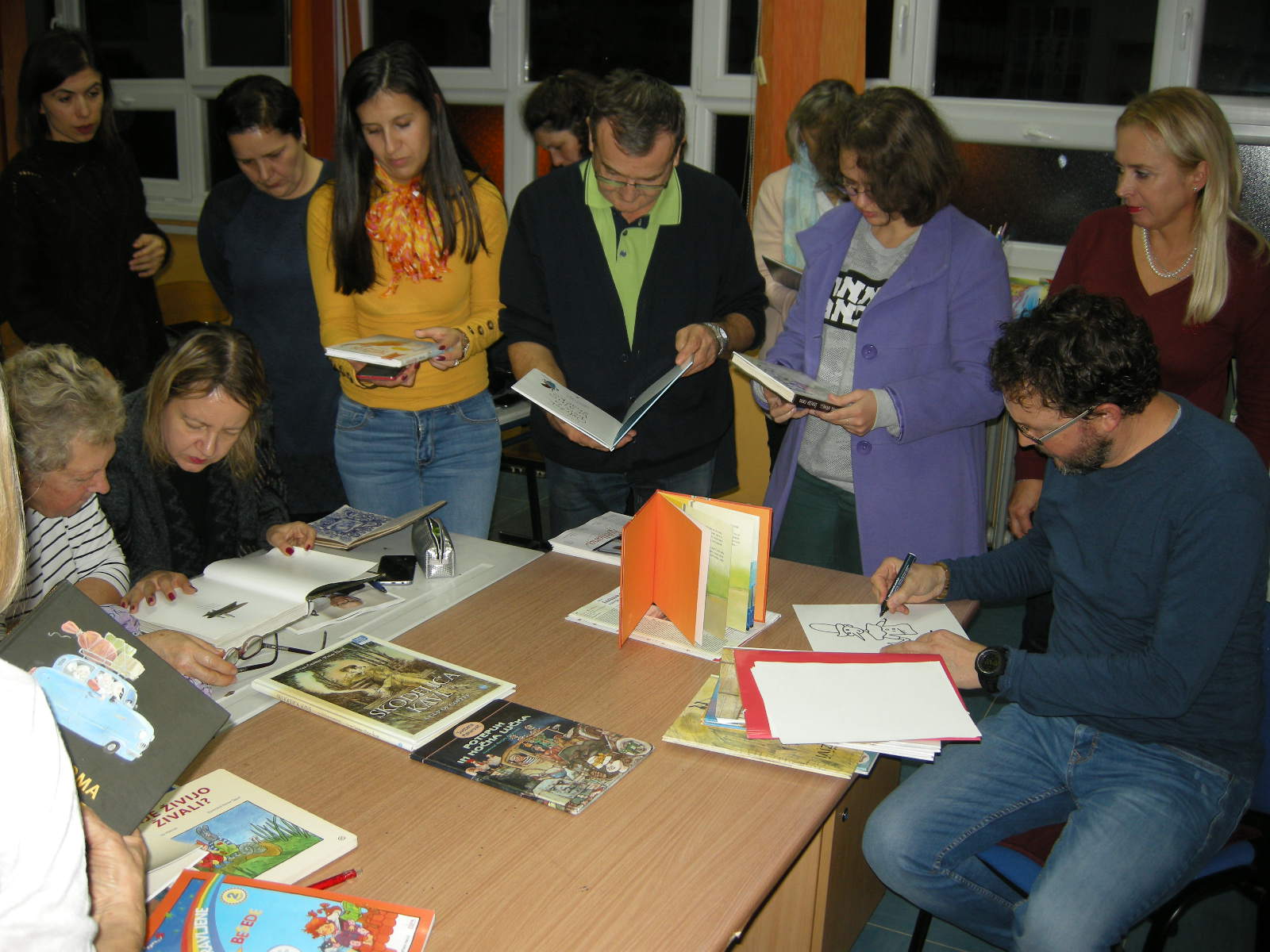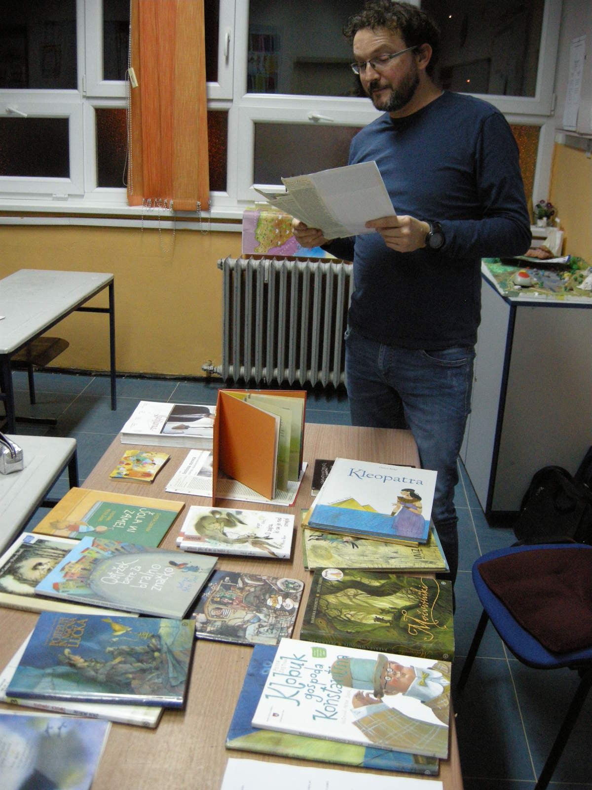 Peter Škerl je na Akademiji za likovno umetnost in oblikovanje Univerze v Ljubljani končal študij ilustracije in oblikovanja vizualnih komunikacij. V Banjaluki umetnika že poznamo, saj je leta 2017 v Klubu narodnih manjšin razstavljal črno-bele ilustracije, nastale po romanu Georga Orwella Živalska farma. Takrat je vodil tudi delavnico za osnovnošolce in srednješolce. Tokrat so med poslušalci prevladovali starejši. Dobra dela, namenjena otrokom, so večplastna in zato ponujajo veliko tudi odraslim. Peter Škerl je pripovedoval o začetkih svoje ustvarjalne poti in o delih, ki so njega kot otroka najbolj zaznamovala. Pogovarjali smo se o pomenu ilustracij, o ilustriranju del, ki med bralci že živijo z drugo likovno govorico, o raziskovanju teme pred začetkom dela in o vsem tem, česar pisatelj ne zapiše, ilustrator pa v besedilu poišče in nariše. Ilustracija ni le podpora besedilu, ampak je tudi samostojna pripoved.